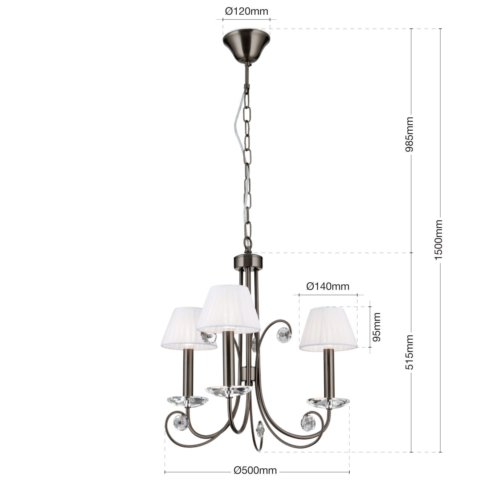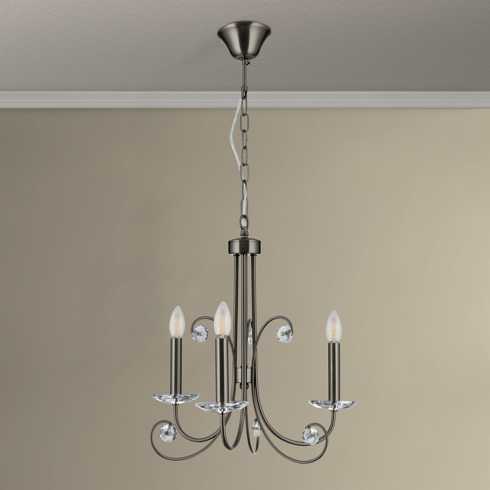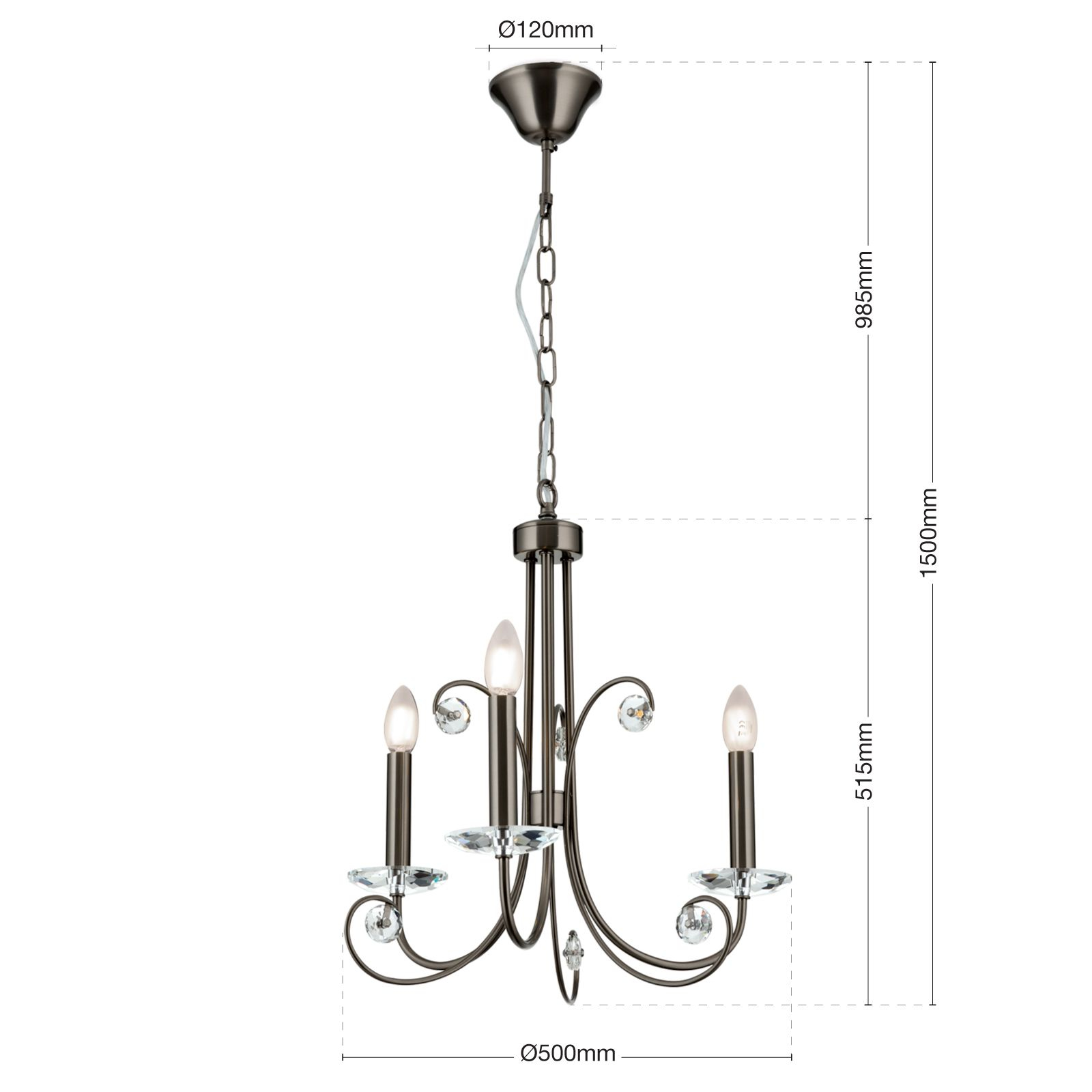Осветителното тяло LU 1842/3 dark-nickel (3xE14) представлява полилей в класически стил. LU 1842/3 dark-nickel (3xE14) е от категорията осветителни тела и е подходящо за осветяване на различни помещения и пространства като: всекидневна / хол, спалня, кухня, трапезария, офис.