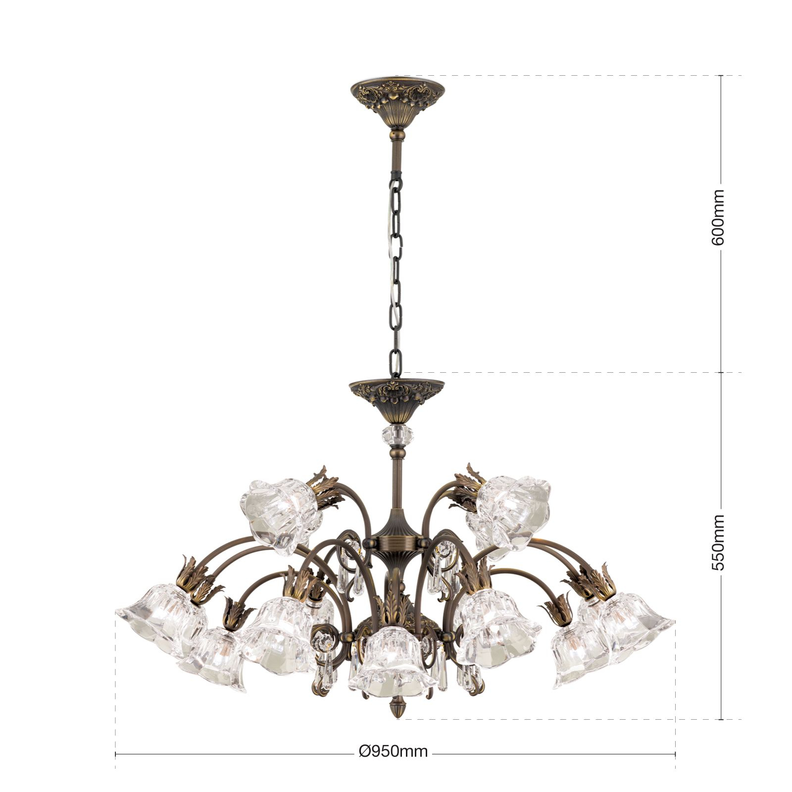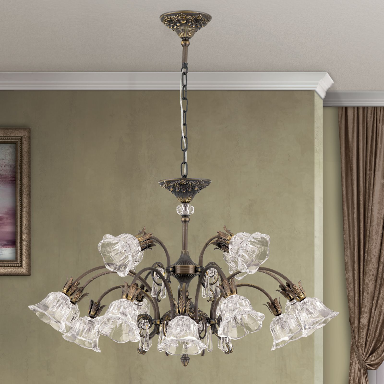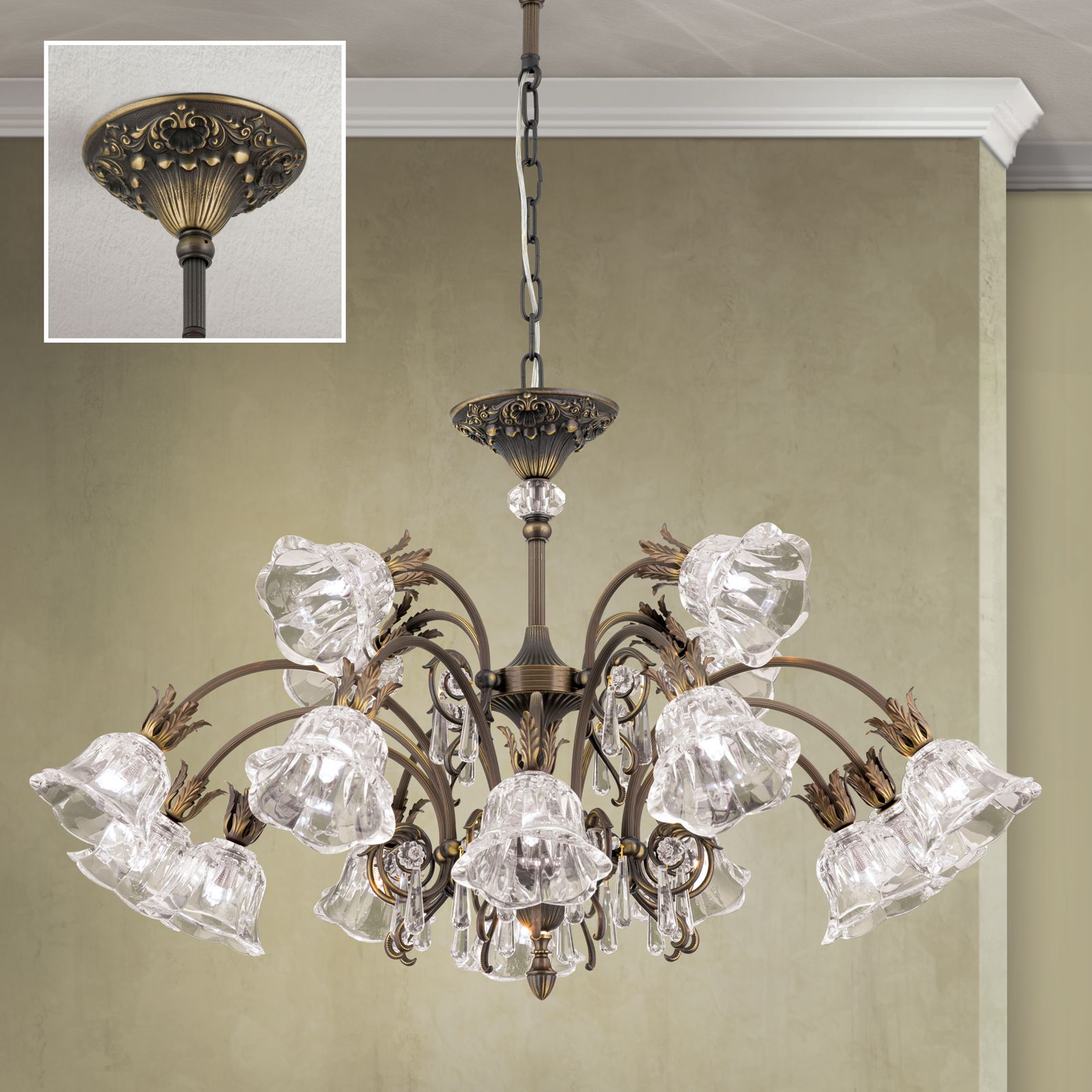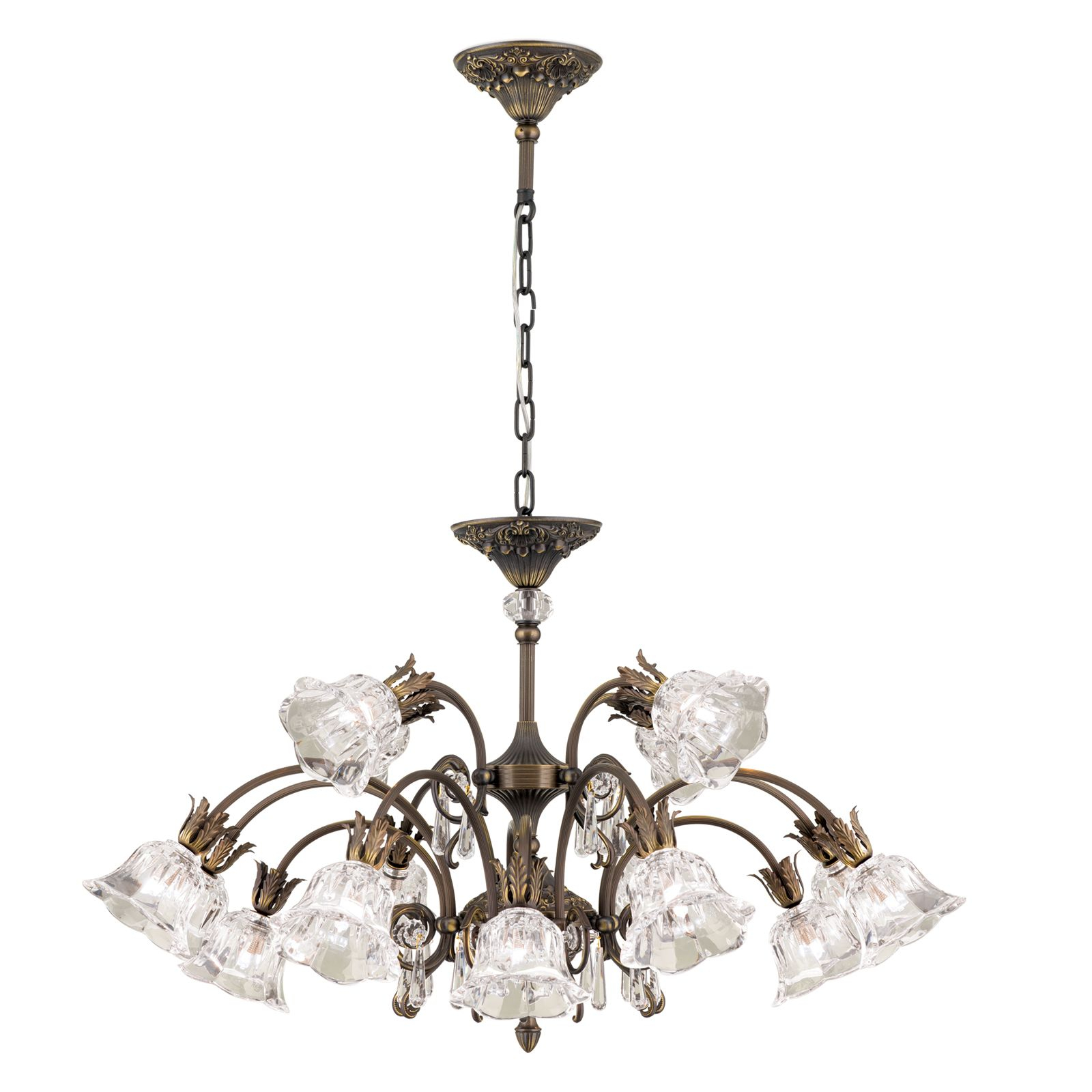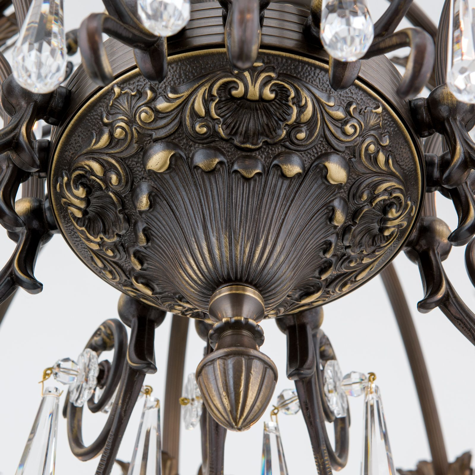 масивен месинг с ръчно нанесено покритие в цвят стара патина, кристали и шлифовано кристално стъкло А1