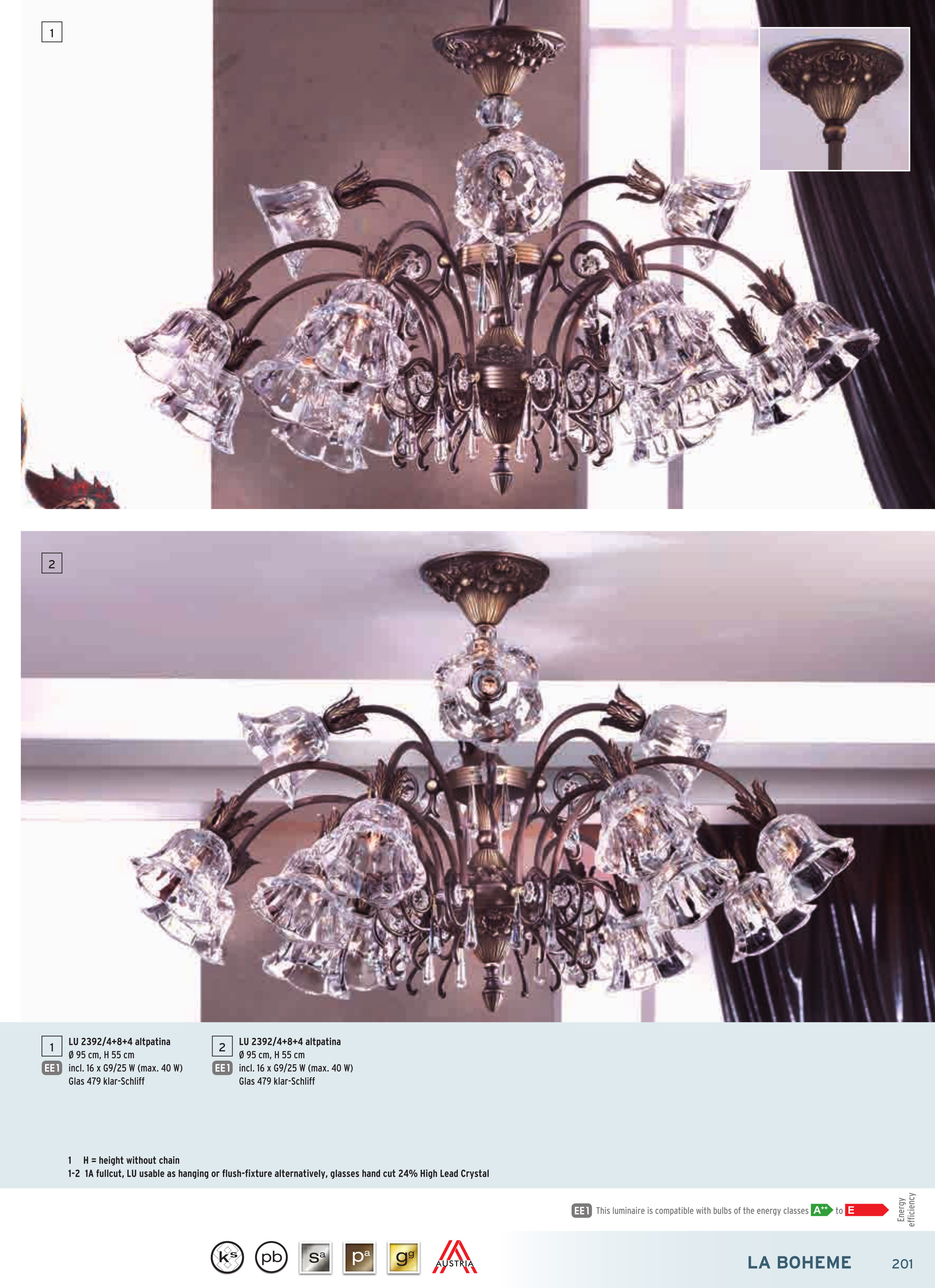 Осветителното тяло LU 2392/4+8+4 Altpatina/479 Schliff ще осигури комфорт и естетика във всяко помещение, в което се постави. Цялостната визия и дизайн на лампата и вложените в изработката й материали, като масивен месинг с ръчно нанесено покритие в цвят стара патина, кристали и шлифовано кристално стъкло А1, ще допринесат за един неповторим стил. Благодарение на дългогодишния опит, качествените материали и строгия контрол на качеството на изработка на производителя Orion (Австрия), LU 2392/4+8+4 Altpatina/479 Schliff е на високо европейско ниво.