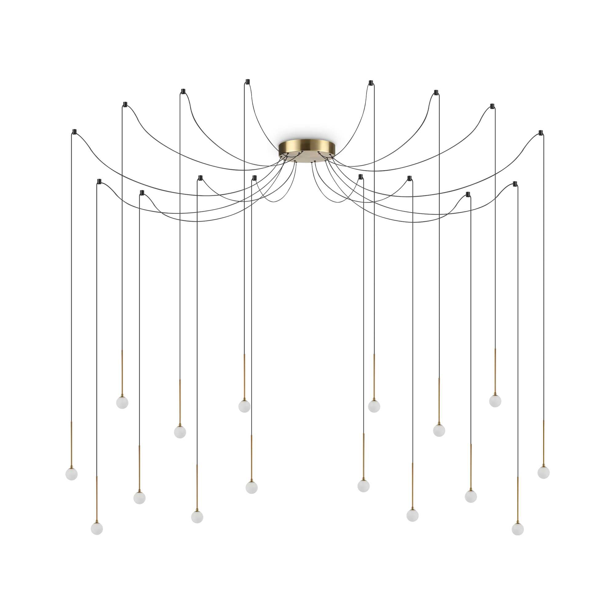 таванна розетка от метал с месингово покритие, нанесено по прахова технология, осветителни тела с месингов финиш, сферични дифузьори от сатениран акрил, PVC кабели в черно, алуминиеви таванни носачи в черен цвят