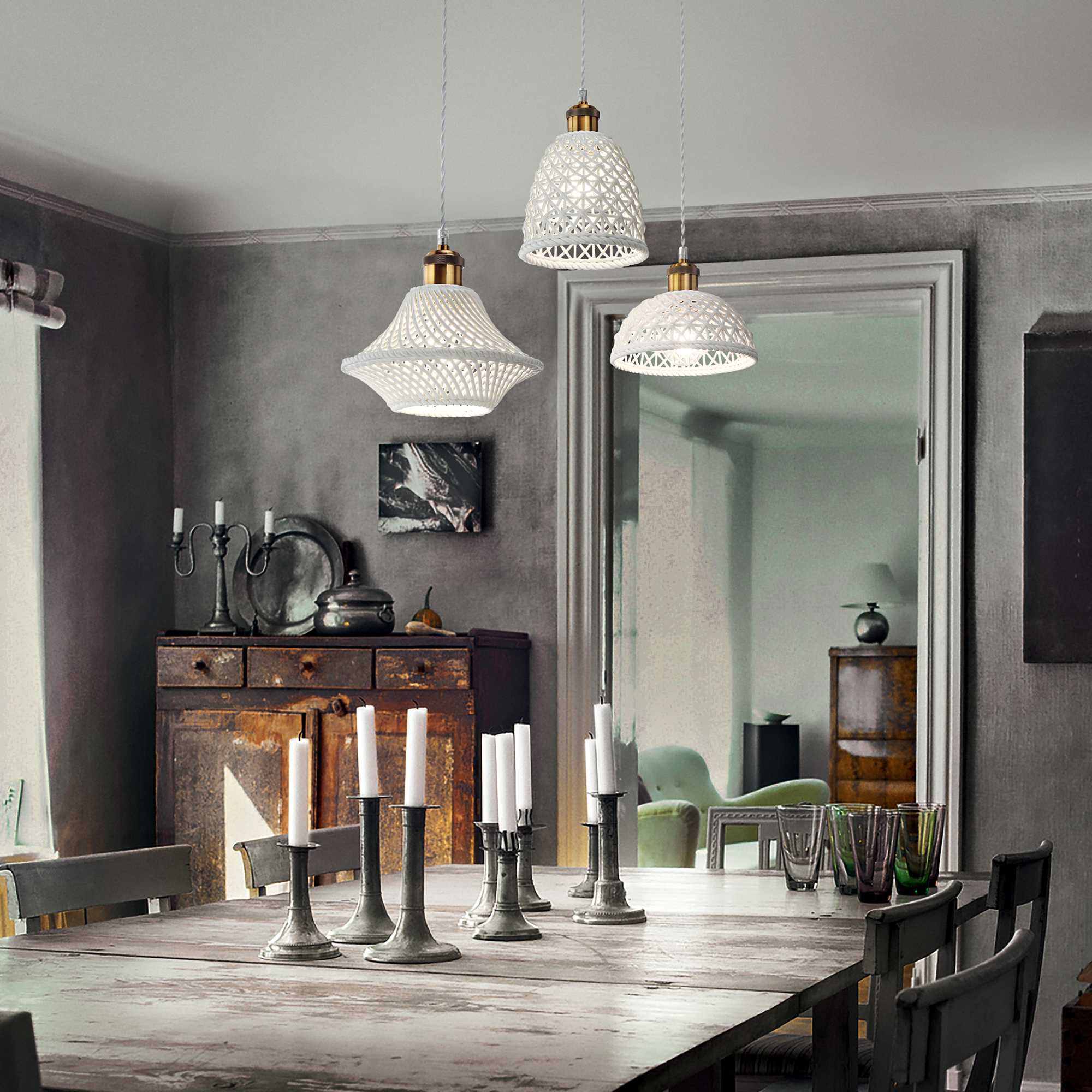 порцелан в бяло, метал в цвят античен месинг, захранващ кабел с бяла текстилна оплетка