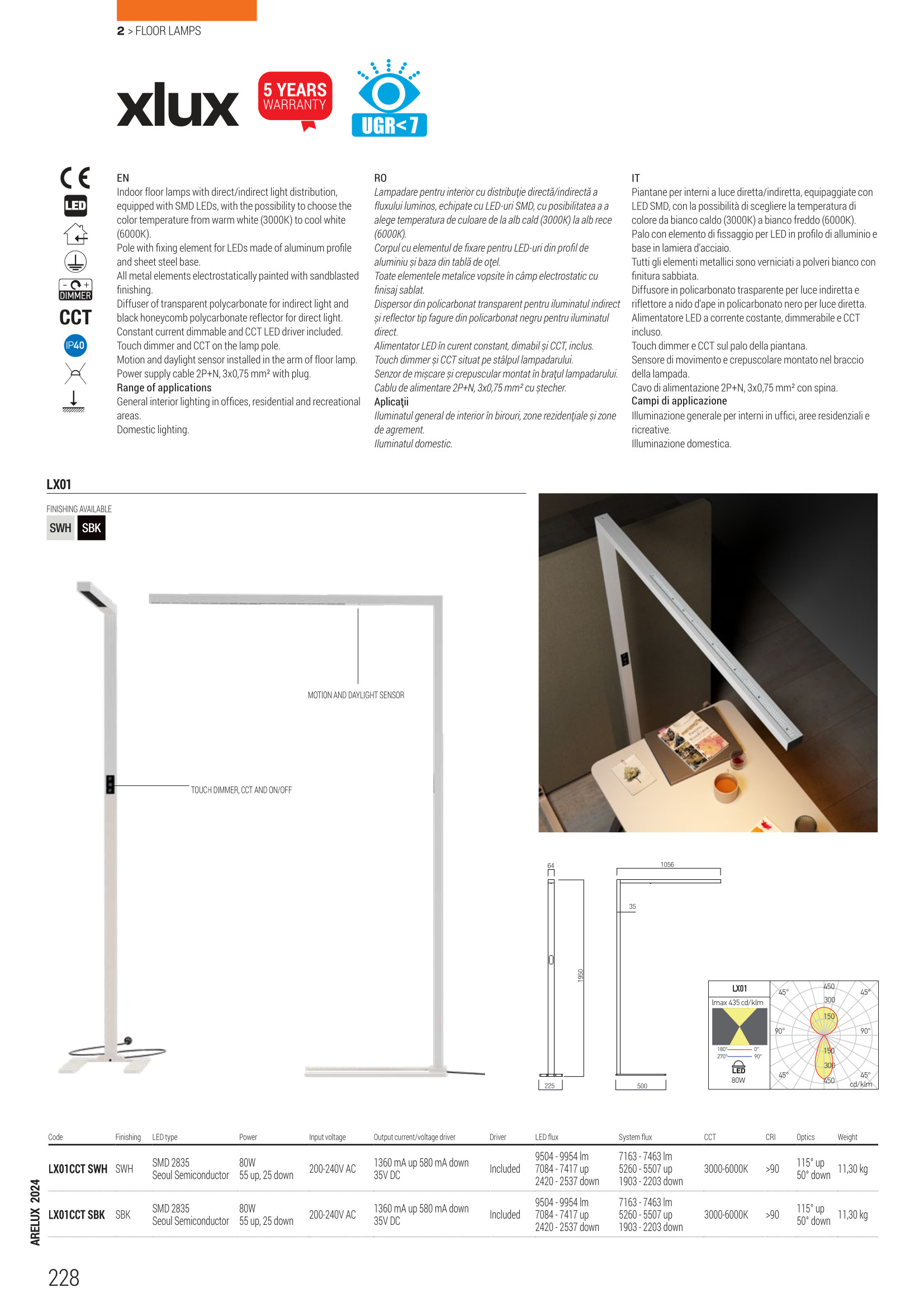 Осветителното тяло LX01CCT SBK ще осигури комфорт и естетика във всяко помещение, в което се постави. Цялостната визия и дизайн на лампата и вложените в изработката й материали, като алуминиев профил, основа от стомана в пясъчно черен цвят чрез пясъкоструйно покритие, дифузер от прозрачен поликарбонат за индиректна светлина и черен, тип пчелна пита за директна светлина, ССТ 3000-6000K, димируема и със сензор за движение и осветеност, ще допринесат за един неповторим стил. Благодарение на дългогодишния опит, качествените материали и строгия контрол на качеството на изработка на дизайнерската линия Redo Arelux на производителя Redo (Румъния), LX01CCT SBK е на високо европейско ниво.