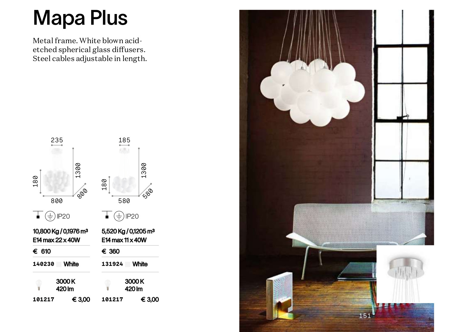 Осветителното тяло MAPA PLUS BIANCO SP11 представлява полилей в съвременен, дизайнерски стил. MAPA PLUS BIANCO SP11 е от категорията осветителни тела и е подходящо за осветяване на различни помещения и пространства като: всекидневна / хол, спалня, кухня, трапезария, офис.