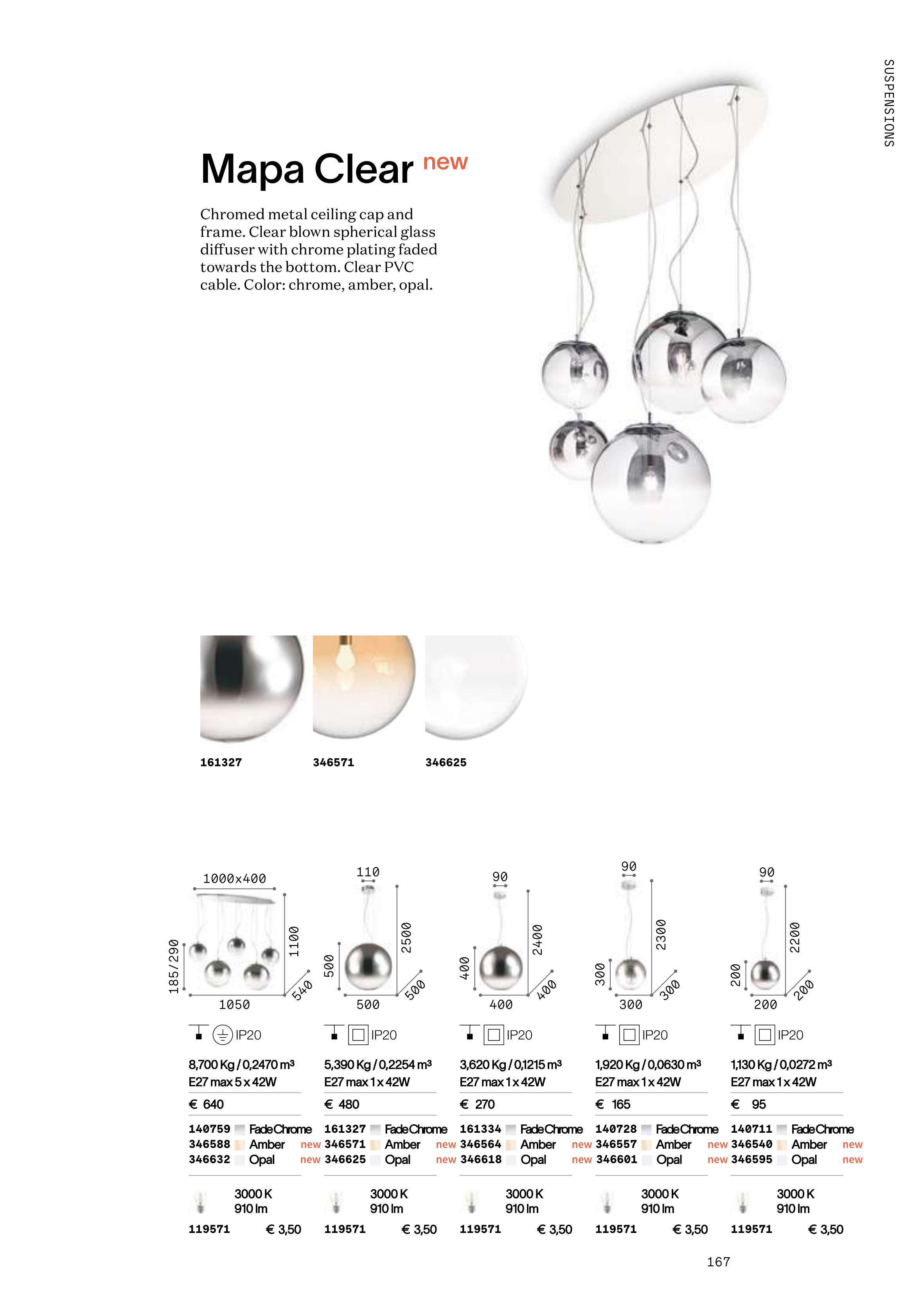 Осветителното тяло MAPA CLEAR SP1 D20 OPAL ще осигури комфорт и естетика във всяко помещение, в което се постави. Цялостната визия и дизайн на лампата и вложените в изработката й материали, като метал в бяло, сферичен дифузьор от прозрачно духано стъкло в цвят опал, прозрачен PVC кабел, ще допринесат за един неповторим стил. Благодарение на дългогодишния опит, качествените материали и строгия контрол на качеството на изработка на производителя Ideal-Lux (Италия), MAPA CLEAR SP1 D20 OPAL е на високо европейско ниво.