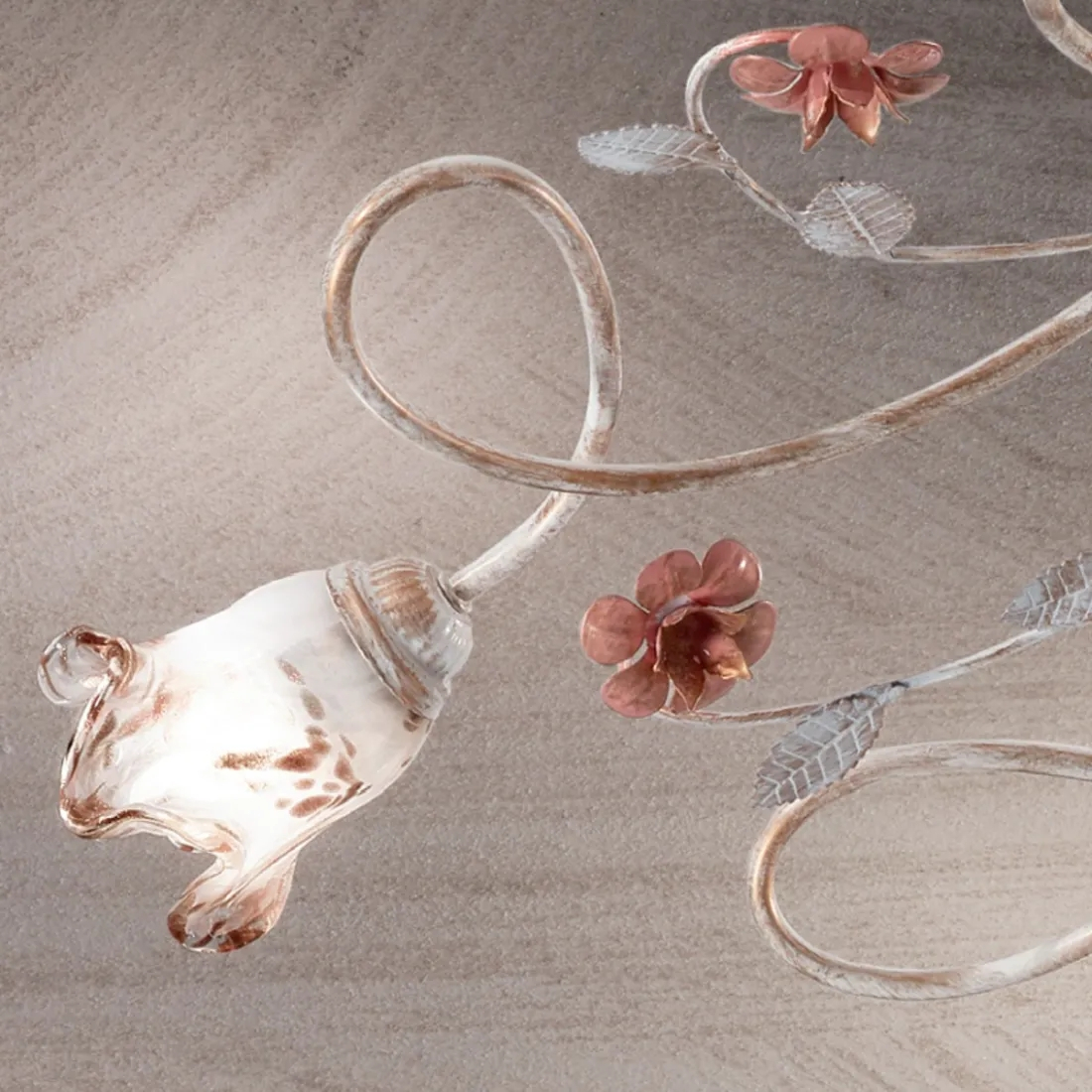 лъскаво бяло стъкло с патина от бронзов авантюрин, метал в цвят антична слонова кост с розови цветя