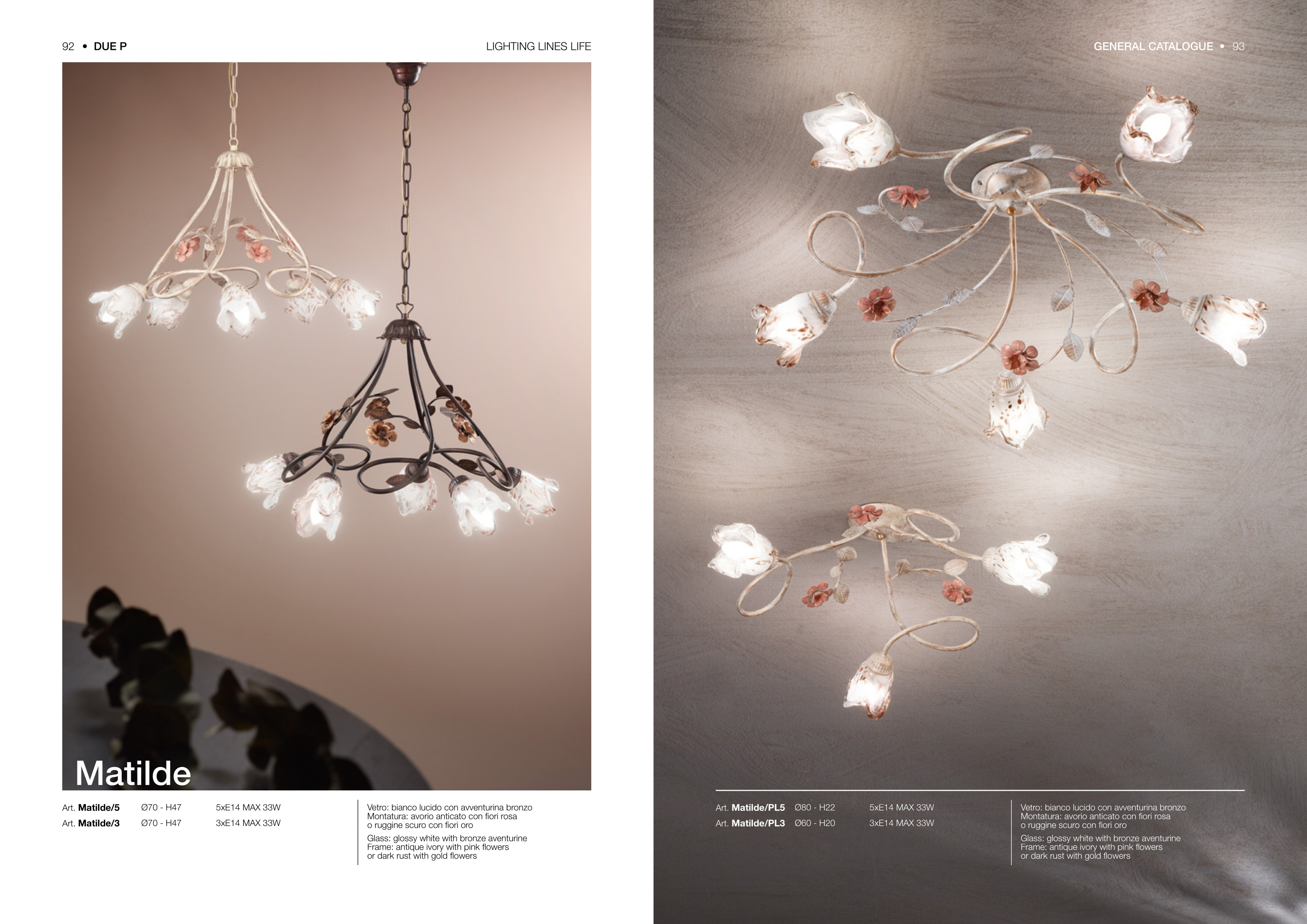 Осветителното тяло MATILDE/PL3 AVORIO ще осигури комфорт и естетика във всяко помещение, в което се постави. Цялостната визия и дизайн на лампата и вложените в изработката й материали, като лъскаво бяло стъкло с патина от бронзов авантюрин, метал в цвят антична слонова кост с розови цветя, ще допринесат за един неповторим стил. Благодарение на дългогодишния опит, качествените материали и строгия контрол на качеството на изработка на производителя DueP (Италия), MATILDE/PL3 AVORIO е на високо европейско ниво.