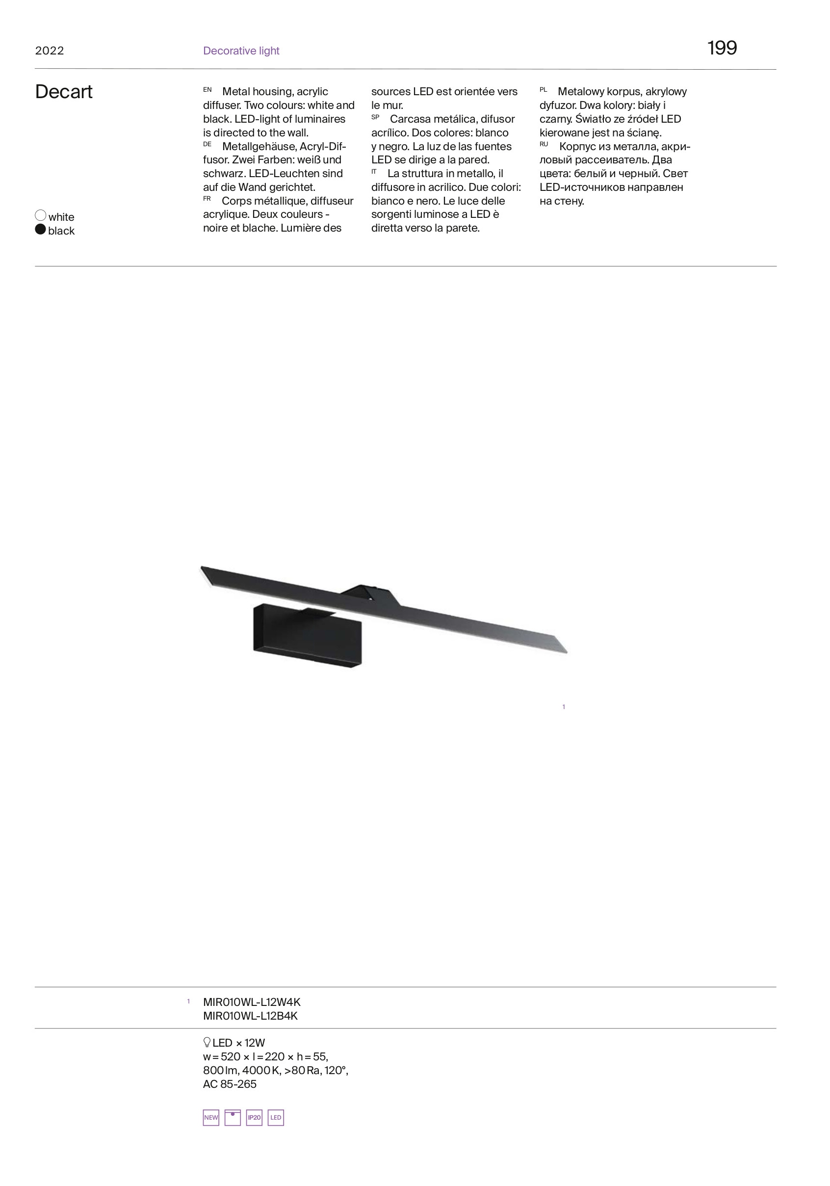 Осветителното тяло MIR010WL-L12B4K представлява лед аплик в съвременен стил. MIR010WL-L12B4K е от категорията и е подходящо за осветяване на различни помещения и пространства като: всекидневна / хол, спалня, кухня, трапезария, офис.