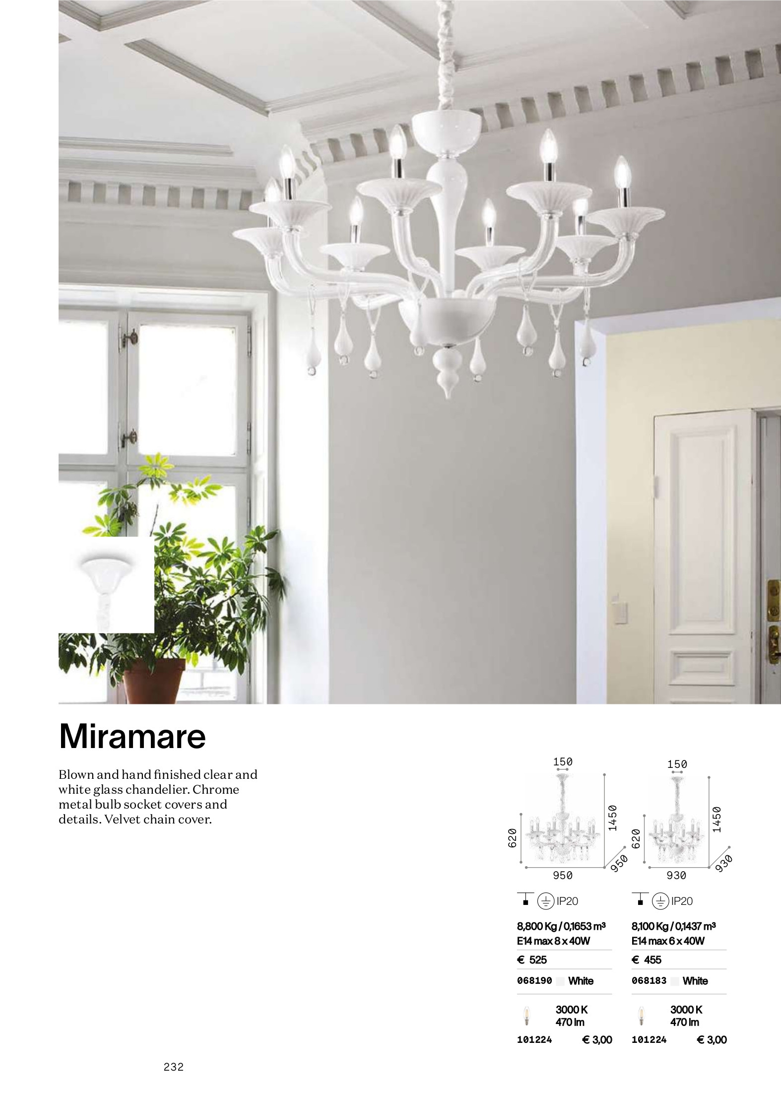 Осветителното тяло MIRAMARE SP6 ще осигури комфорт и естетика във всяко помещение, в което се постави. Цялостната визия и дизайн на лампата и вложените в изработката й материали, като издухано прозрачно и бяло стъкло, обработено ръчно, хромирани метални детайли, кадифено покритие на веригата, ще допринесат за един неповторим стил. Благодарение на дългогодишния опит, качествените материали и строгия контрол на качеството на изработка на производителя Ideal-Lux (Италия), MIRAMARE SP6 е на високо европейско ниво.