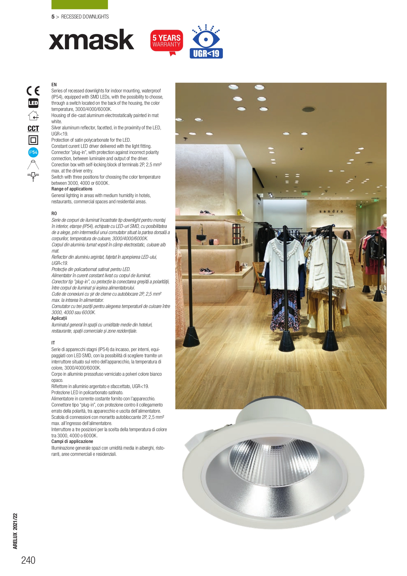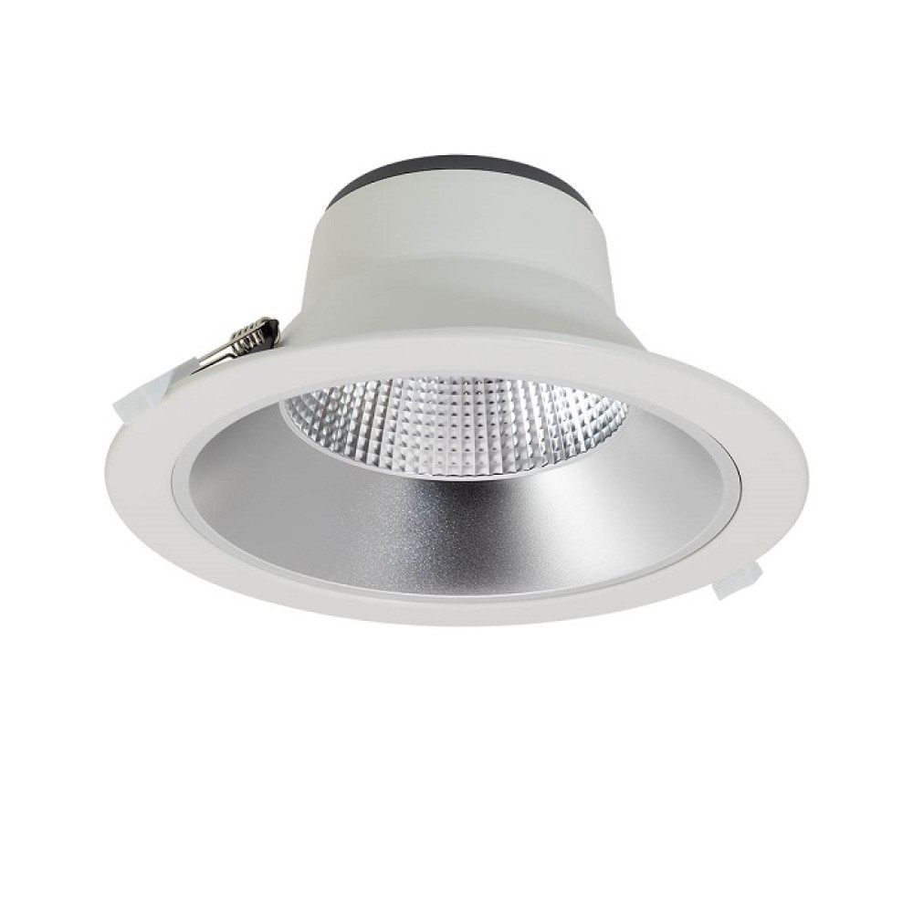 лят алуминий с бяло, електростатично положено, покритие, сребрист алуминиев фасетиран рефлектор, дифузер от сатениран поликарбонат, превключвател на гърба на тялото позволява избор на цветна температура 3000/4000/6000К