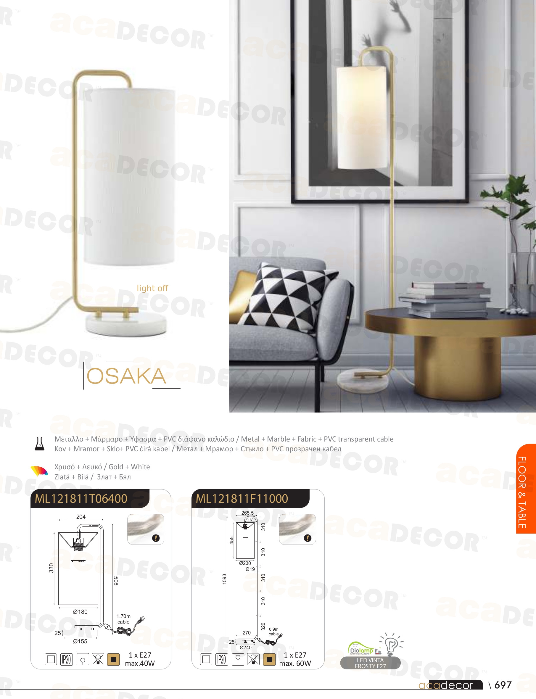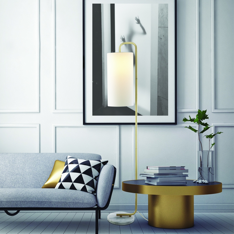 За стила и естетиката на обстановката в изключително висока степен допринасят, както цялостната визия, стилна изработка и елегантен дизайн на осветителното тяло, така също и използваните при изработката материали, като: метал в цвят злато, мрамор в бяло, текстил в бял цвят, прозрачен кабел 0.9m с щепсел и ключ ON/OFF.