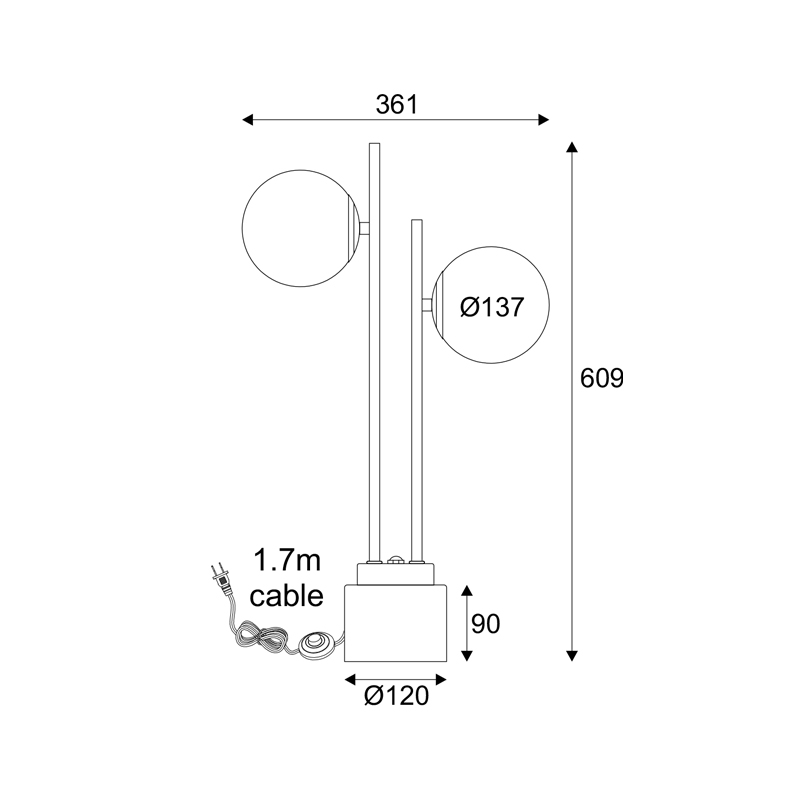 метал в черен цвят, мрамор в бяло, стъкло в бял цвят, черен кабел 1.7m с щепсел и ключ ON/OFF, максимален Ф35mm на крушката