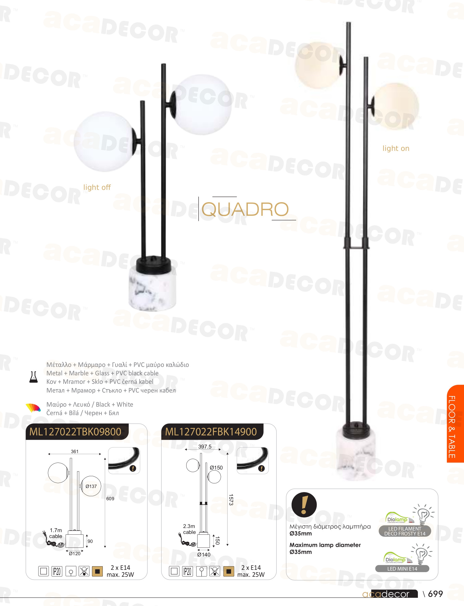 Осветителното тяло ML127022TBK ще осигури комфорт и естетика във всяко помещение, в което се постави. Цялостната визия и дизайн на лампата и вложените в изработката й материали, като метал в черен цвят, мрамор в бяло, стъкло в бял цвят, черен кабел 1.7m с щепсел и ключ ON/OFF, максимален Ф35mm на крушката, ще допринесат за един неповторим стил. Благодарение на дългогодишния опит, качествените материали и строгия контрол на качеството на изработка на производителя ACA-Lighting (Гърция), ML127022TBK е на високо европейско ниво.