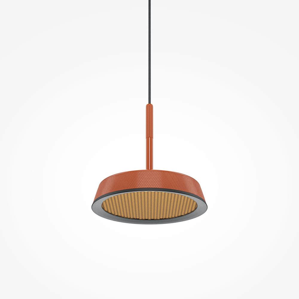 метал в златен цвят и цвят теракота, осветително тяло тип "таблетка" с графичен модел от асиметрични линии