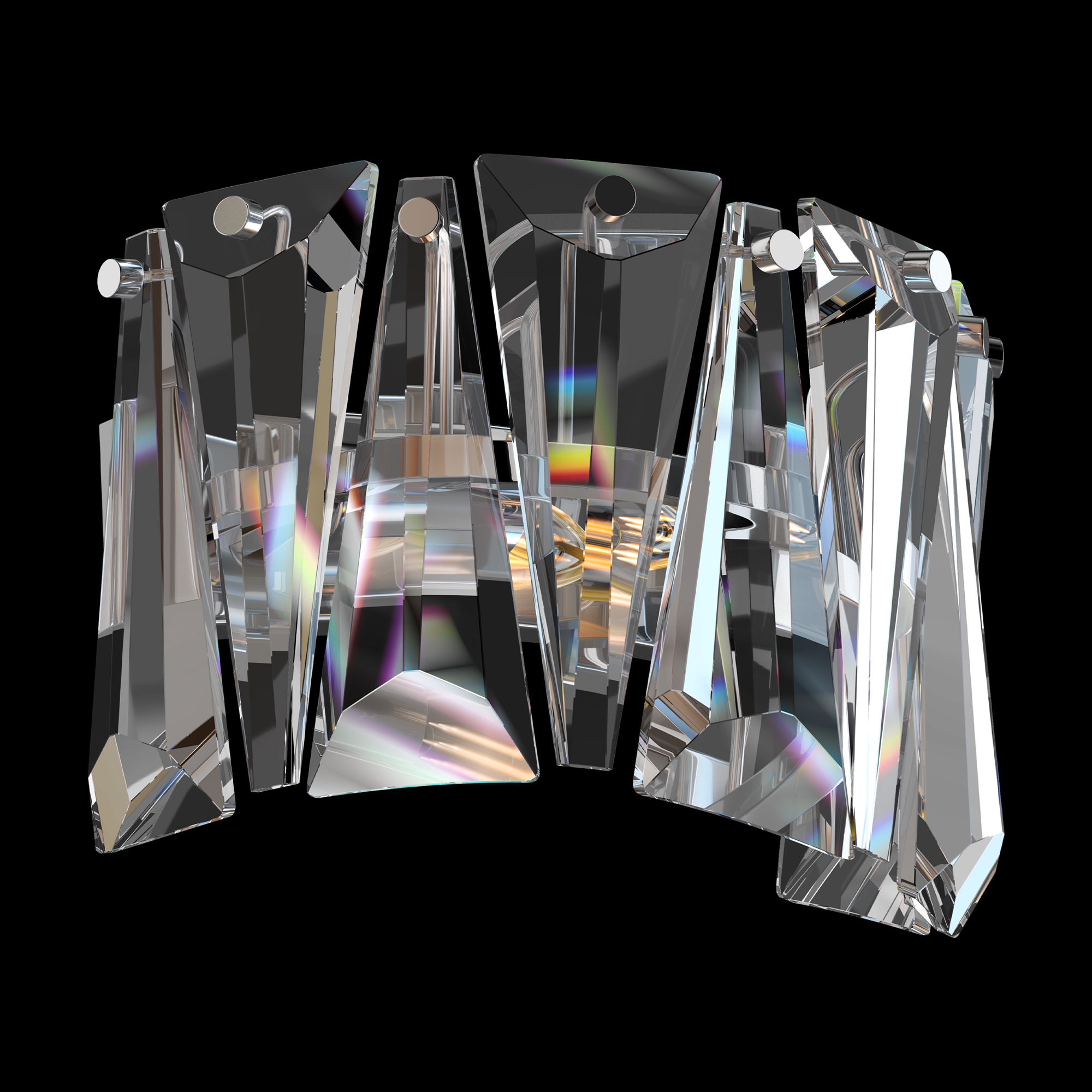 За стила и естетиката на обстановката допринасят, както цялостната визия и дизайн на осветителното тяло, така и вложените в изработката качествени материали, като: метал в цвят хром, стъклени призми от полирано стъкло.