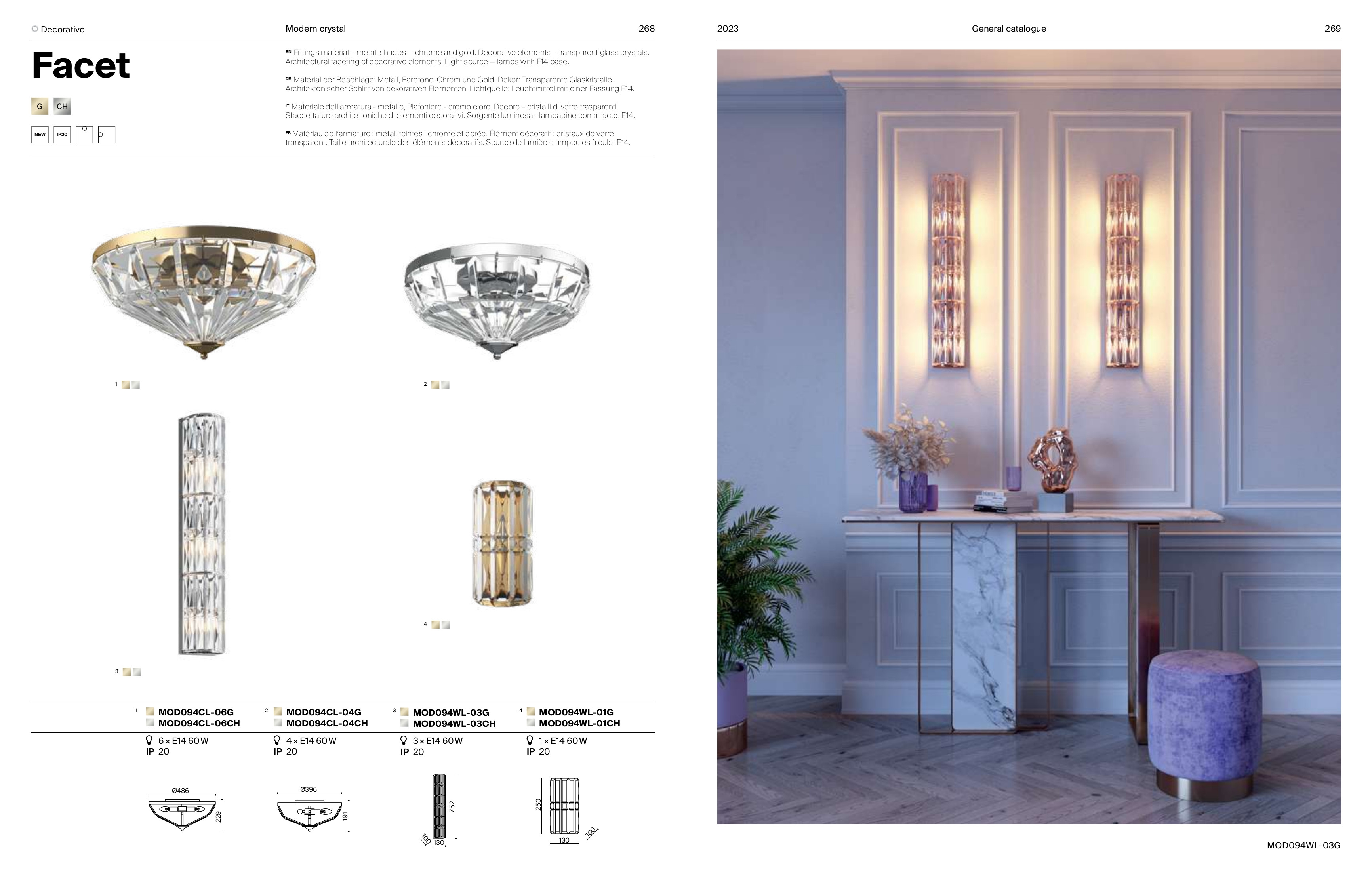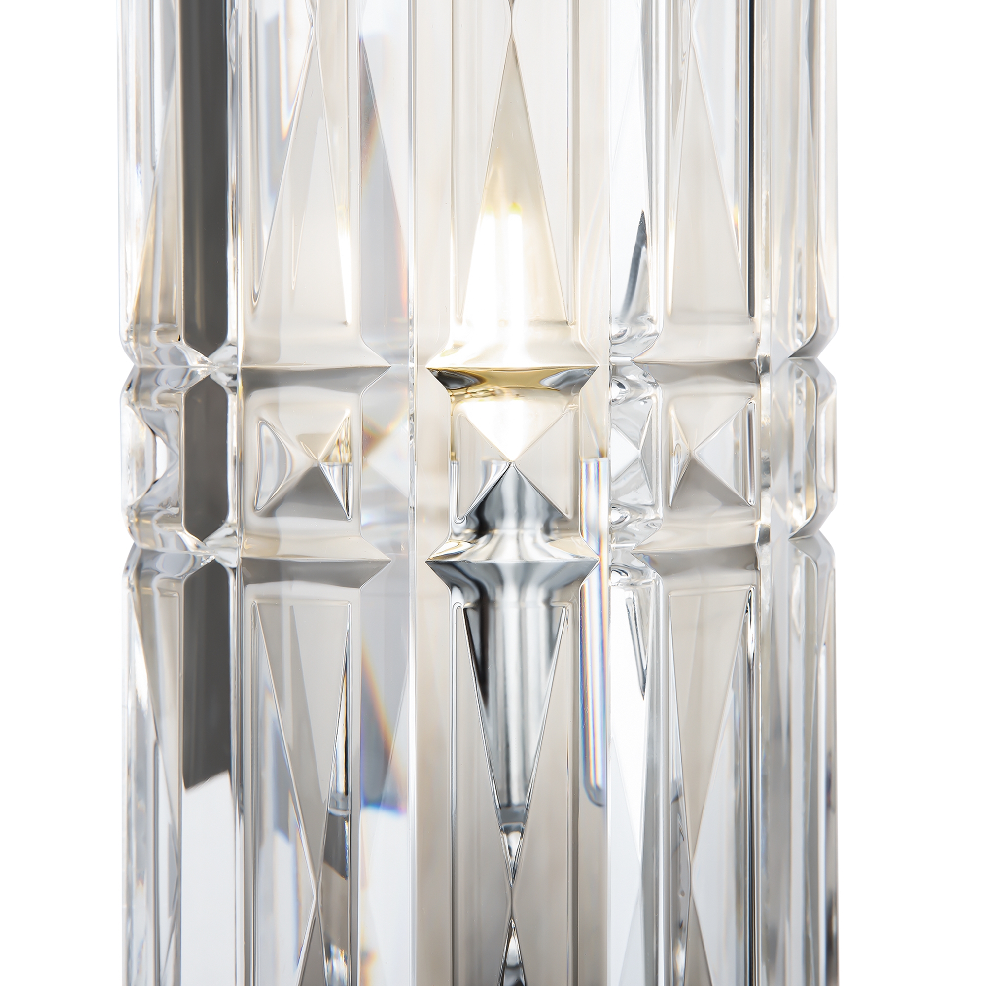 За стила и естетиката на обстановката допринасят, както цялостната визия и дизайн на осветителното тяло, така и вложените в изработката качествени материали, като: метал в цвят хром, фасетирани стъклени кристали.