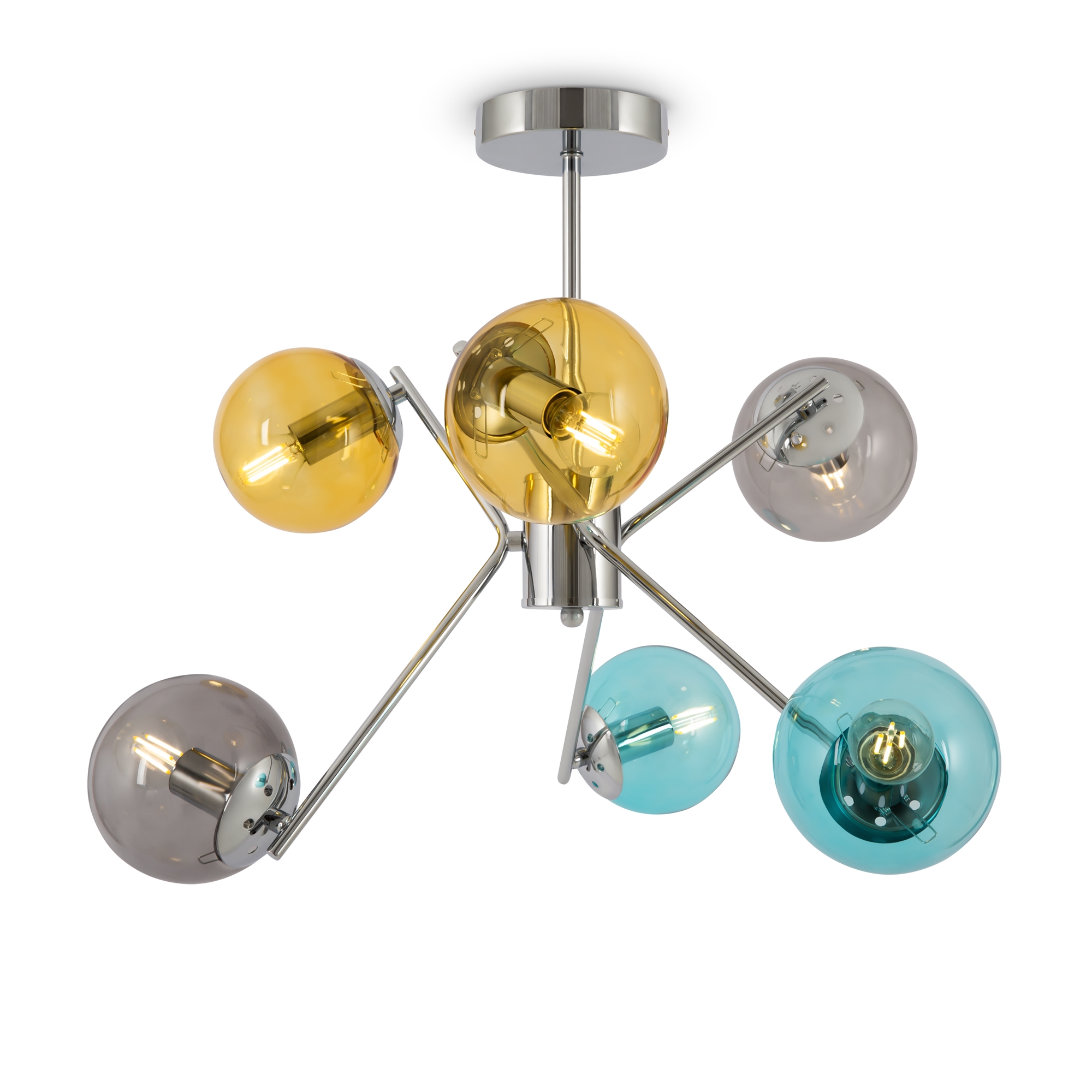 Осветителното тяло MOD139PL-06CH ще осигури комфорт и естетика във всяко помещение, в което се постави. Цялостната визия и дизайн на лампата и вложените в изработката й материали, като хромиран метал, прозрачни стъклени сфери в жълто, синьо и сиво, ще допринесат за един неповторим стил. Благодарение на дългогодишния опит, качествените материали и строгия контрол на качеството на изработка на производителя Maytoni (Германия), MOD139PL-06CH е на високо европейско ниво.