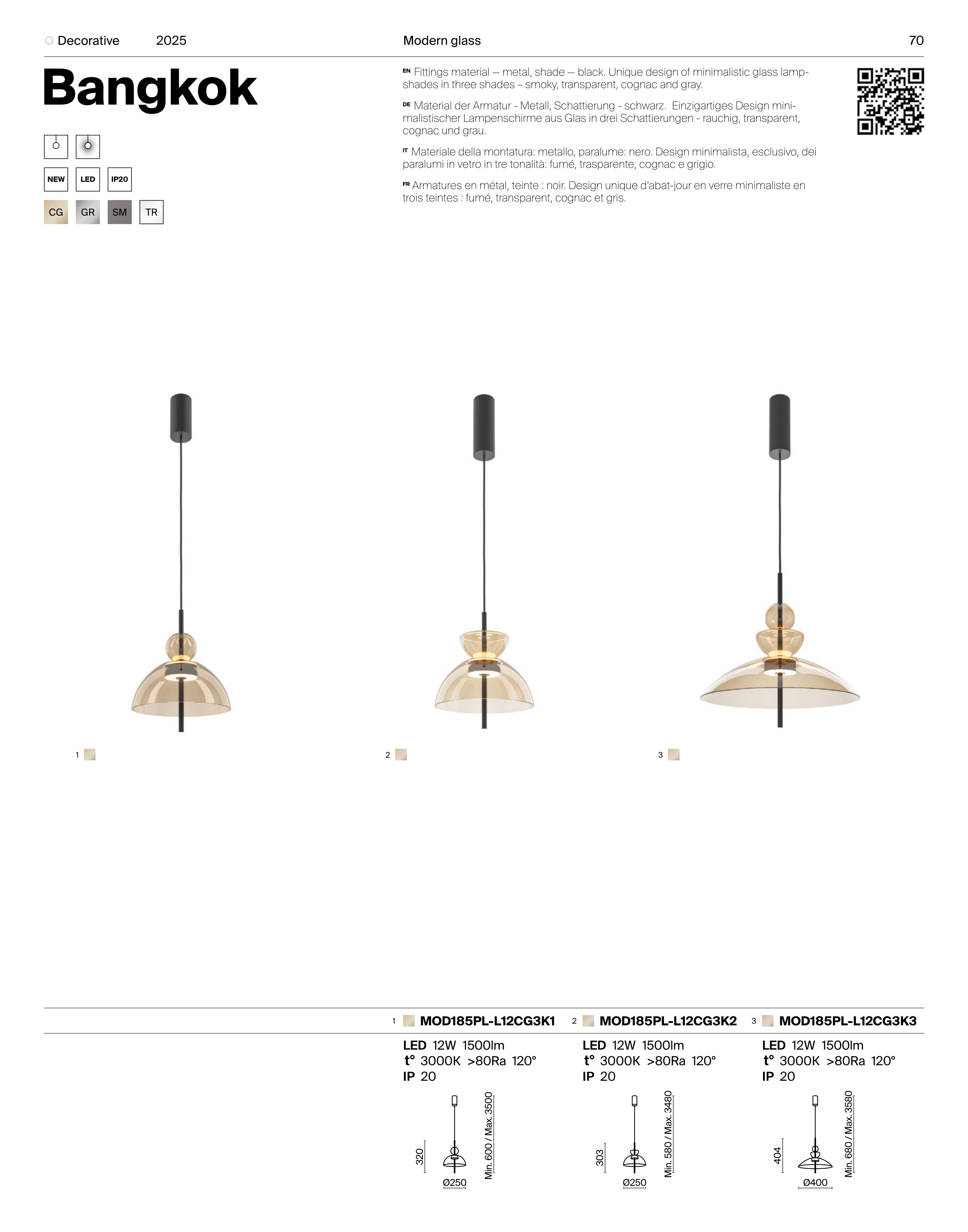 Осветителното тяло MOD185PL-L12CG3K3 представлява пендел в дизайнерски стил. MOD185PL-L12CG3K3 е от категорията осветителни тела и е подходящо за осветяване на различни помещения и пространства като: всекидневна / хол, спалня, кухня, трапезария, коридор, антре, стълбище, офис.