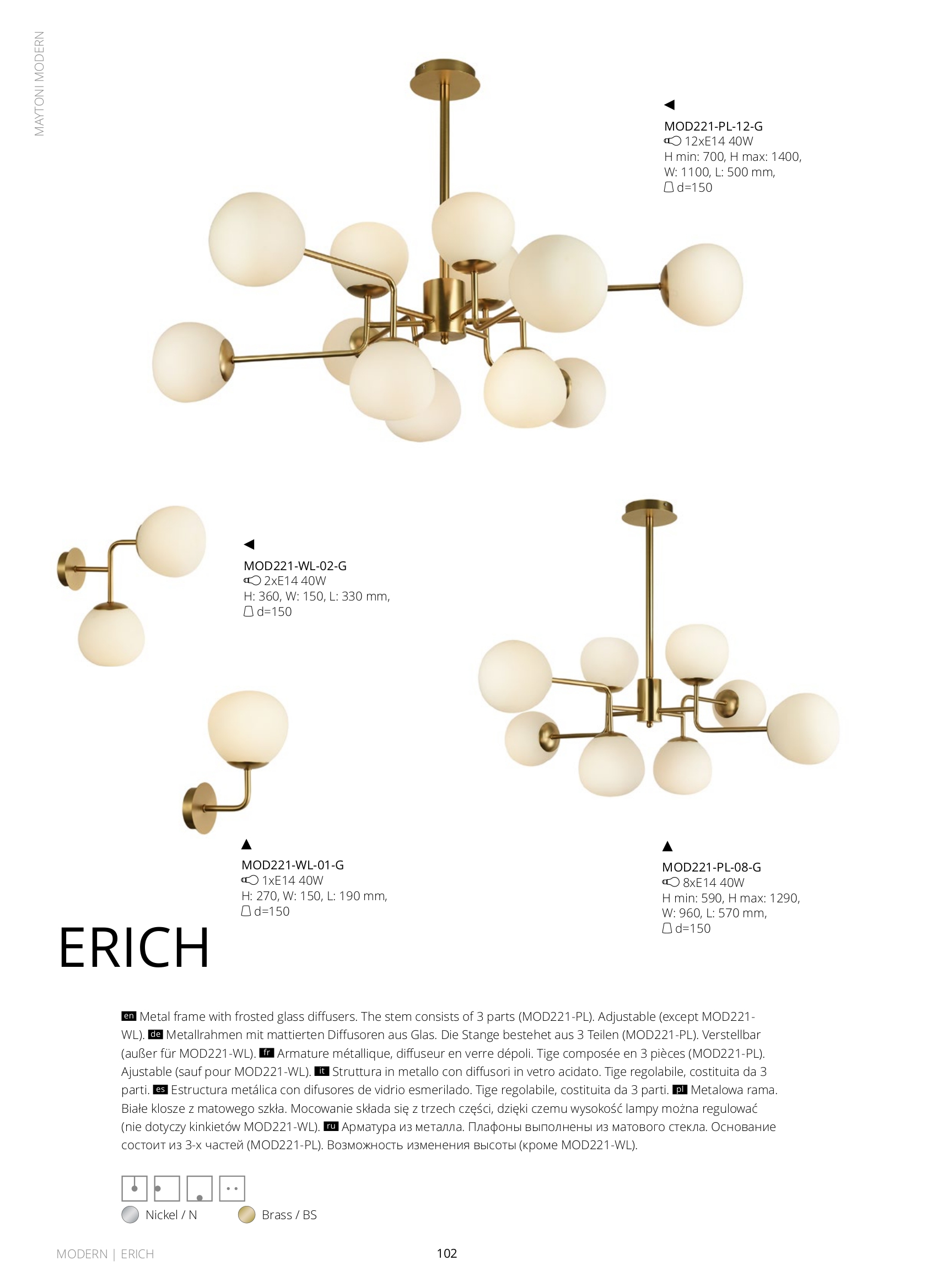 Осветителното тяло MOD221-WL-02-G ще осигури комфорт и естетика във всяко помещение, в което се постави. Цялостната визия и дизайн на лампата и вложените в изработката й материали, като метална основа в златисто, дифузьори от матирано стъкло, ще допринесат за един неповторим стил. Благодарение на дългогодишния опит, качествените материали и строгия контрол на качеството на изработка на производителя Maytoni (Германия), MOD221-WL-02-G е на високо европейско ниво.