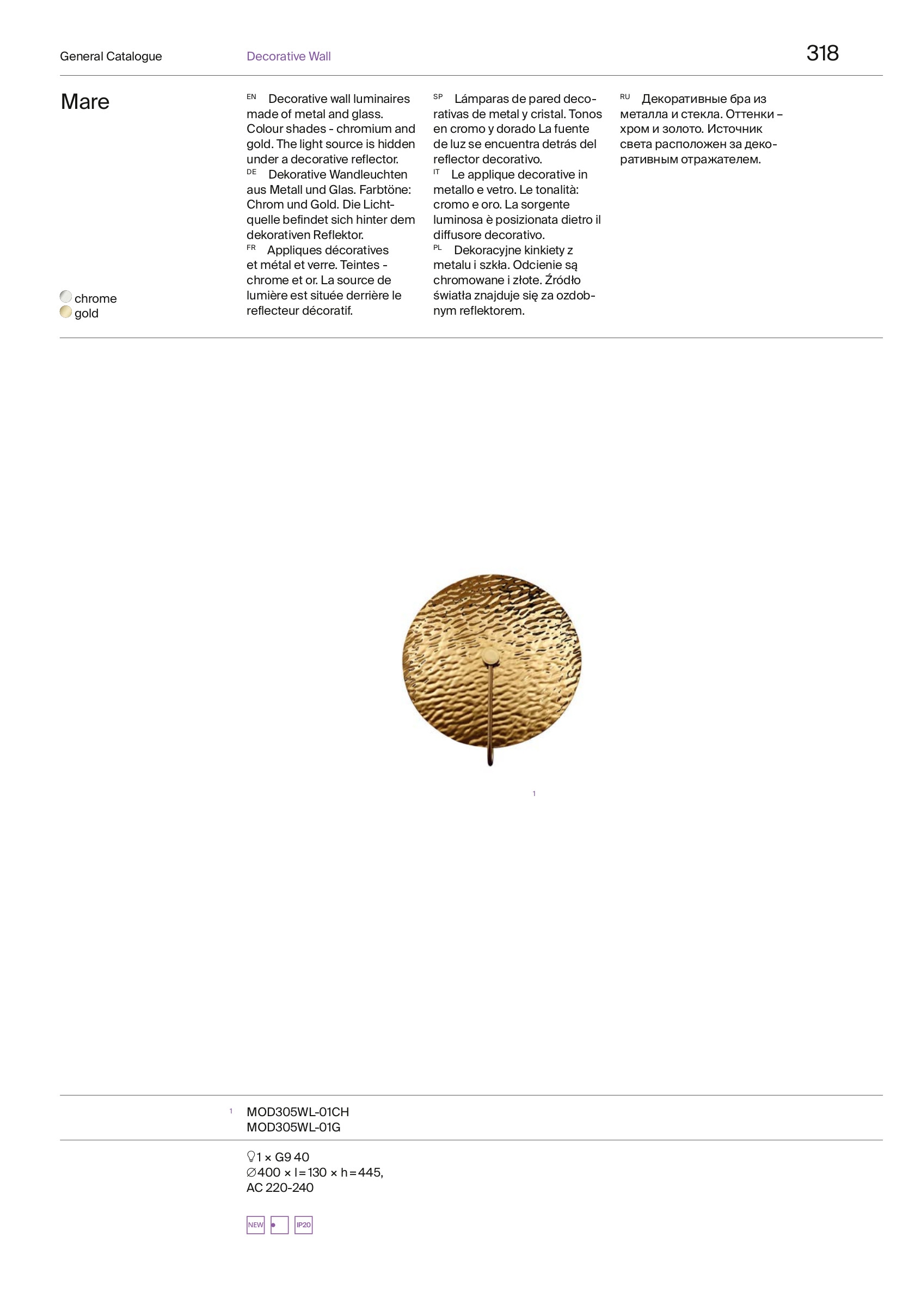 Осветителното тяло MOD305WL-01CH представлява аплик в съвременен, дизайнерски стил. MOD305WL-01CH е от категорията осветителни тела и е подходящо за осветяване на различни помещения и пространства като: всекидневна / хол, спалня, кухня, трапезария, коридор, антре, стълбище, офис.