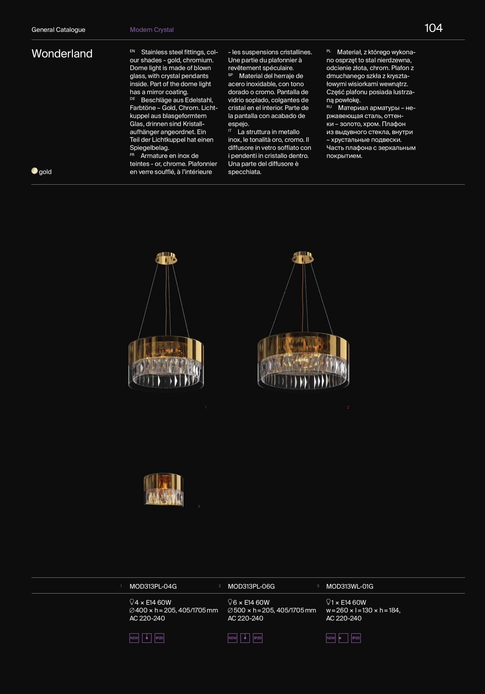 Осветителното тяло MOD313PL-06G ще осигури комфорт и естетика във всяко помещение, в което се постави. Цялостната визия и дизайн на лампата и вложените в изработката й материали, като неръждаема стомана в цвят злато и хром, издухано стъкло, кристални висулки, част от плафона е с огледално покритие, ще допринесат за един неповторим стил. Благодарение на дългогодишния опит, качествените материали и строгия контрол на качеството на изработка на производителя Maytoni (Германия), MOD313PL-06G е на високо европейско ниво.