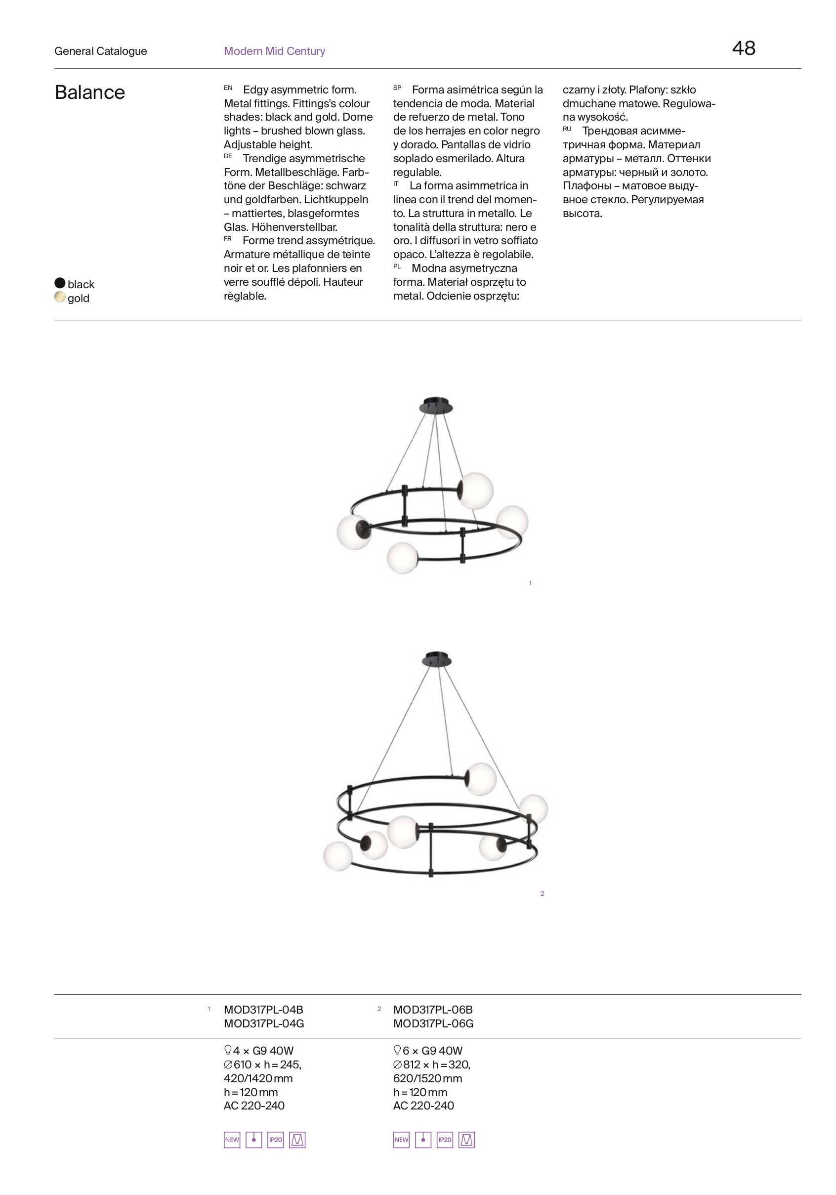 Осветителното тяло MOD317PL-06G представлява полилей в съвременен стил. MOD317PL-06G е от категорията осветителни тела и е подходящо за осветяване на различни помещения и пространства като: всекидневна / хол, спалня, кухня, трапезария, офис.
