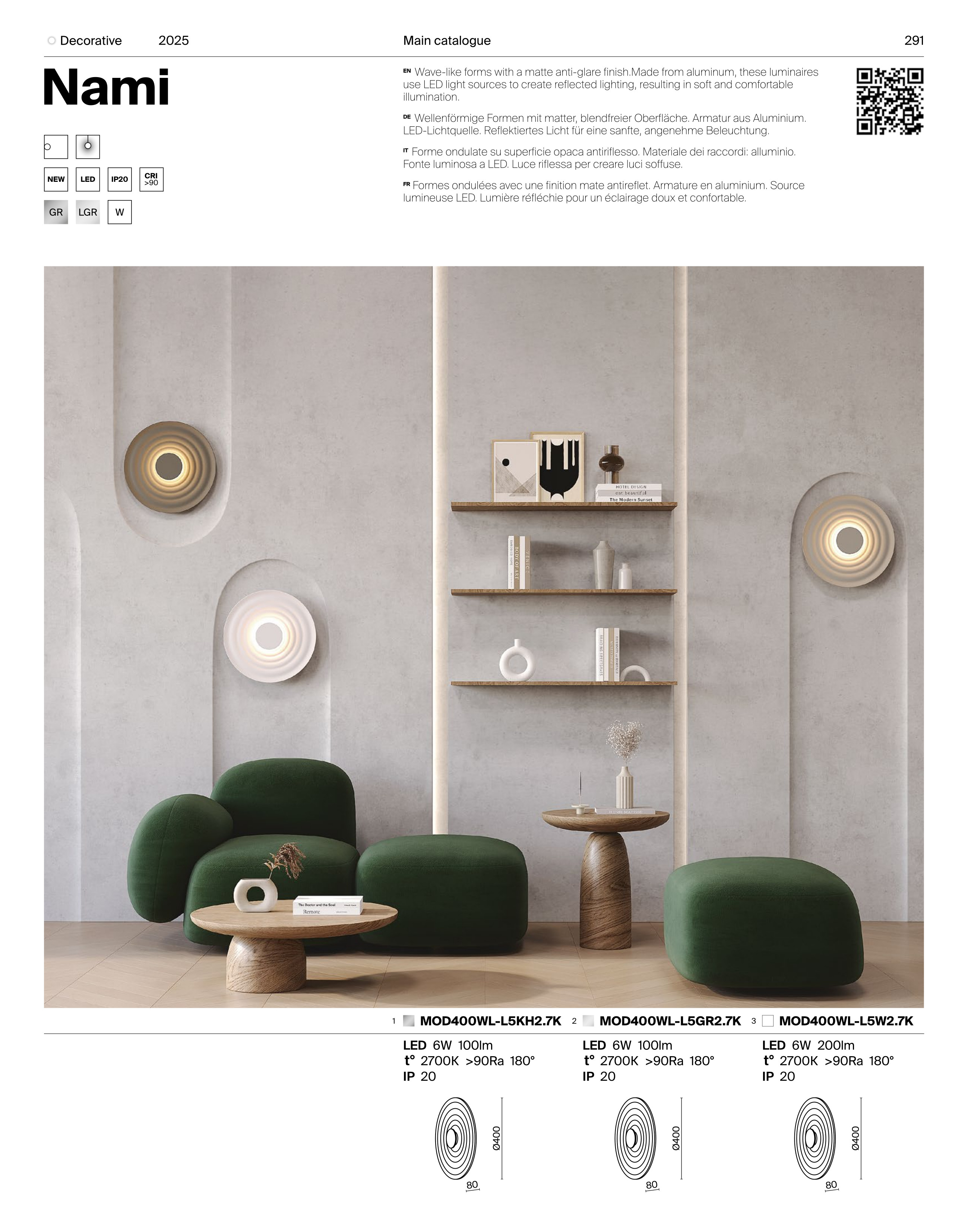 Осветителното тяло MOD400WL-L5W2.7K представлява аплик в съвременен стил. MOD400WL-L5W2.7K е от категорията осветителни тела и е подходящо за осветяване на различни помещения и пространства като: всекидневна / хол, спалня, кухня, трапезария, коридор, антре, стълбище, офис.
