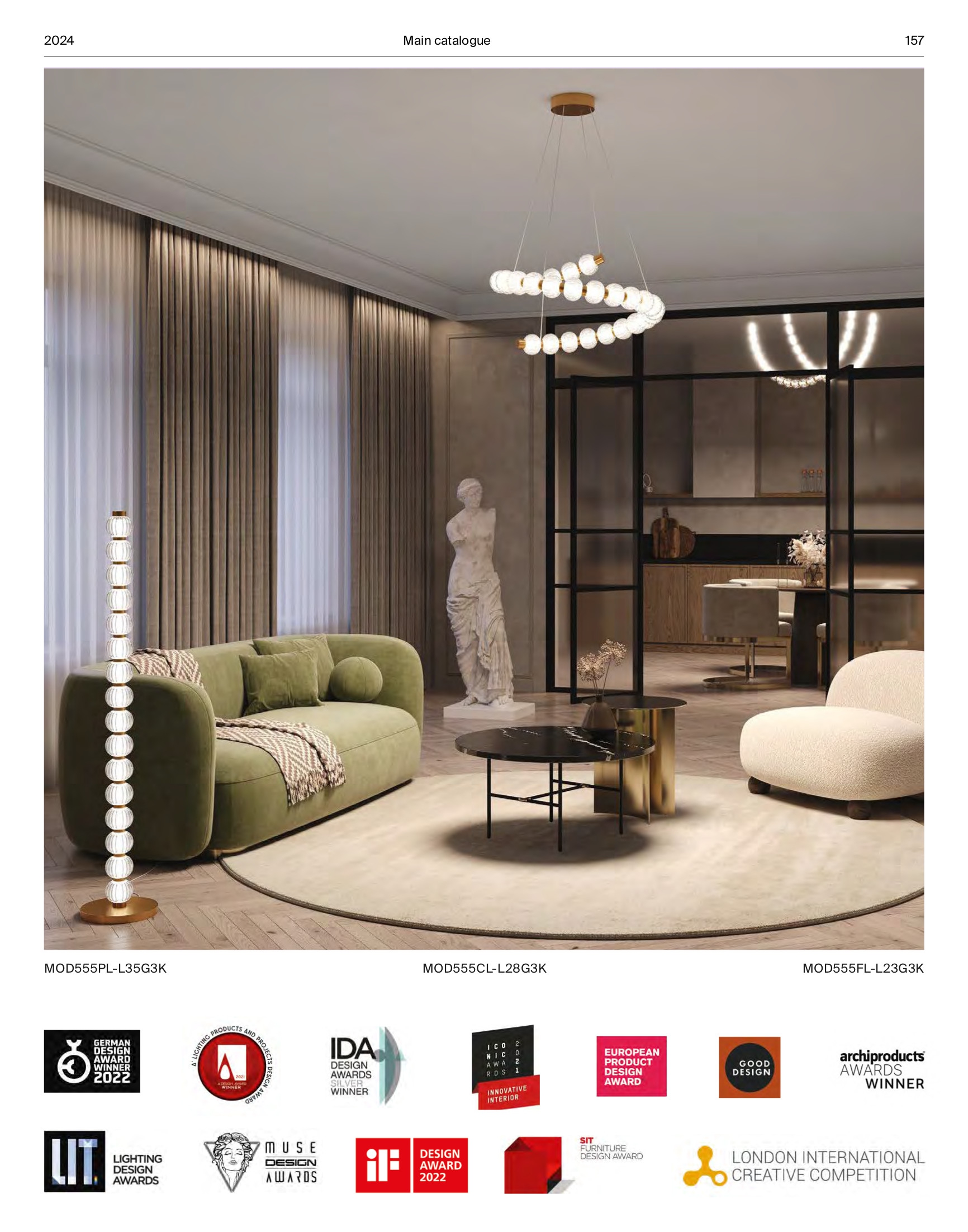Осветителното тяло MOD555WL-L4G3K ще осигури комфорт и естетика във всяко помещение, в което се постави. Цялостната визия и дизайн на лампата и вложените в изработката й материали, като метал в цвят злато, декоративен елемент под формата на релефна сфера от лято стъкло, многократно награждаван дизайн, ще допринесат за един неповторим стил. Благодарение на дългогодишния опит, качествените материали и строгия контрол на качеството на изработка на производителя Maytoni (Германия), MOD555WL-L4G3K е на високо европейско ниво.