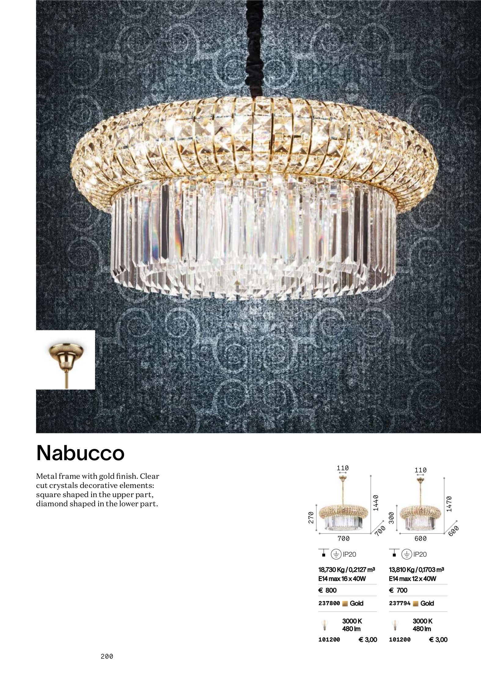 Осветителното тяло NABUCCO SP16 ще осигури комфорт и естетика във всяко помещение, в което се постави. Цялостната визия и дизайн на лампата и вложените в изработката й материали, като метал със златно покритие, декоративни елементи от полирани прозрачни кристали с квадратна форма в горната тороидална част и с форма на диамантена призма в долната част, ще допринесат за един неповторим стил. Благодарение на дългогодишния опит, качествените материали и строгия контрол на качеството на изработка на производителя Ideal-Lux (Италия), NABUCCO SP16 е на високо европейско ниво.
