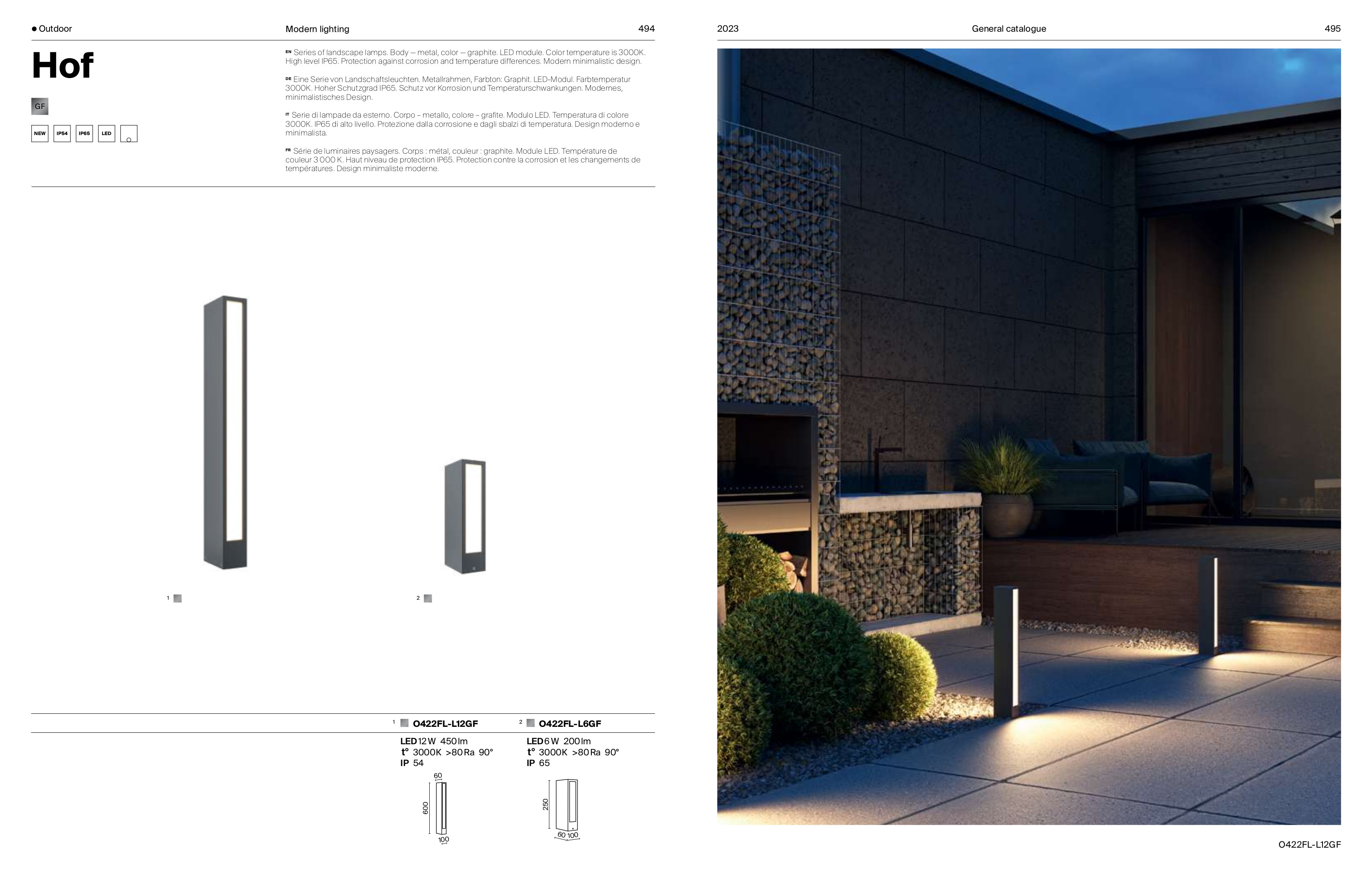 Осветителното тяло O422FL-L12GF представлява външна лампа в съвременен стил. O422FL-L12GF е от категорията осветителни тела и е подходящо за осветяване на различни помещения и пространства като: градинско осветление, външно осветление.