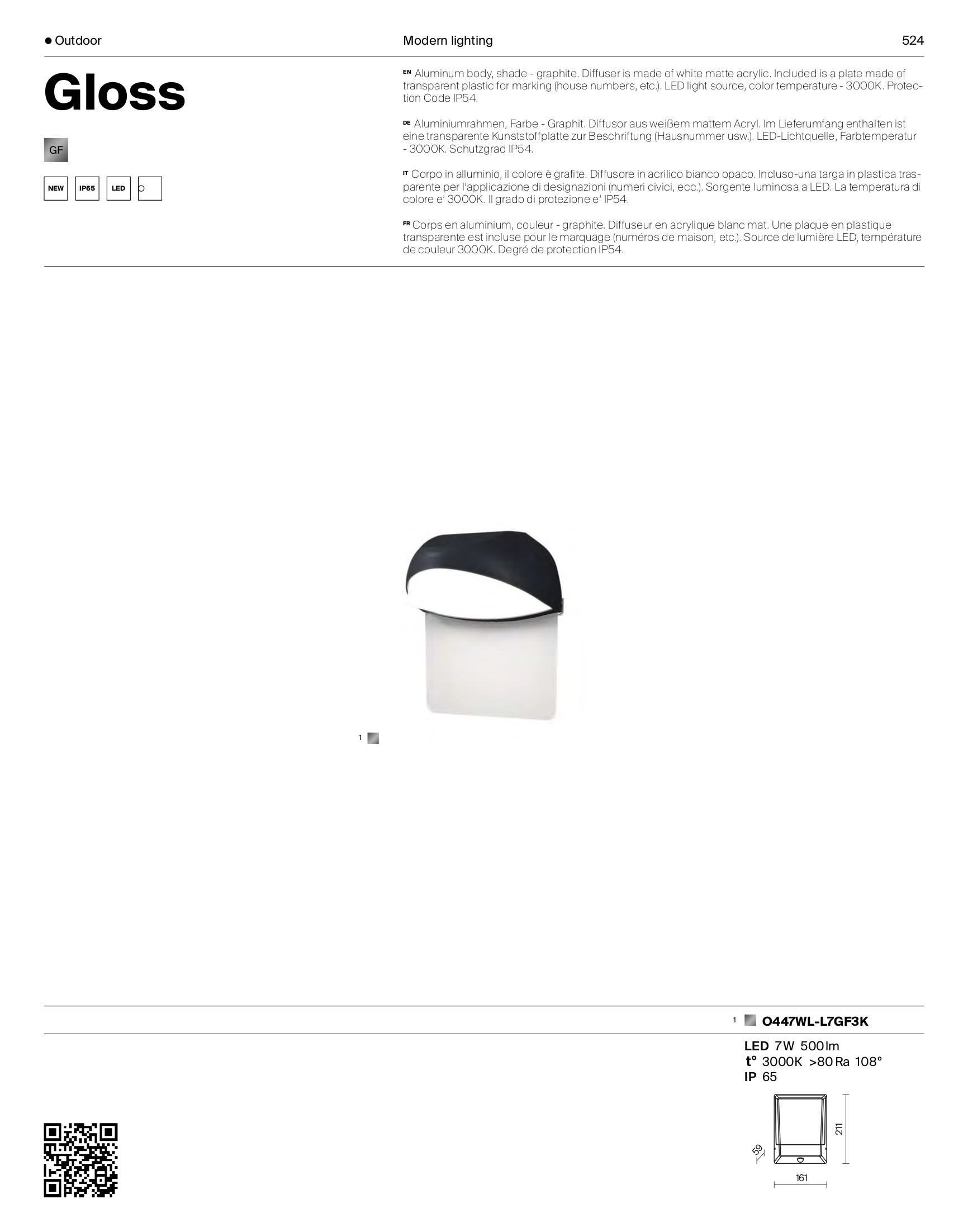 Осветителното тяло O447WL-L7GF3K ще осигури комфорт и естетика във всяко помещение, в което се постави. Цялостната визия и дизайн на лампата и вложените в изработката й материали, като алуминий в цвят графит, дифузер от бял матов акрил, платка от прозрачен полимер за поставяне на символ (номер на къща и др.), ще допринесат за един неповторим стил. Благодарение на дългогодишния опит, качествените материали и строгия контрол на качеството на изработка на производителя Maytoni (Германия), O447WL-L7GF3K е на високо европейско ниво.