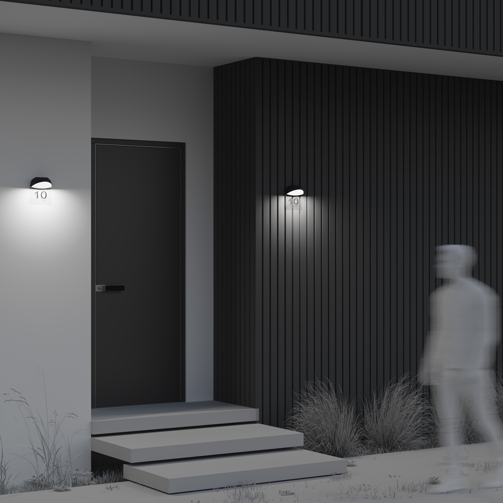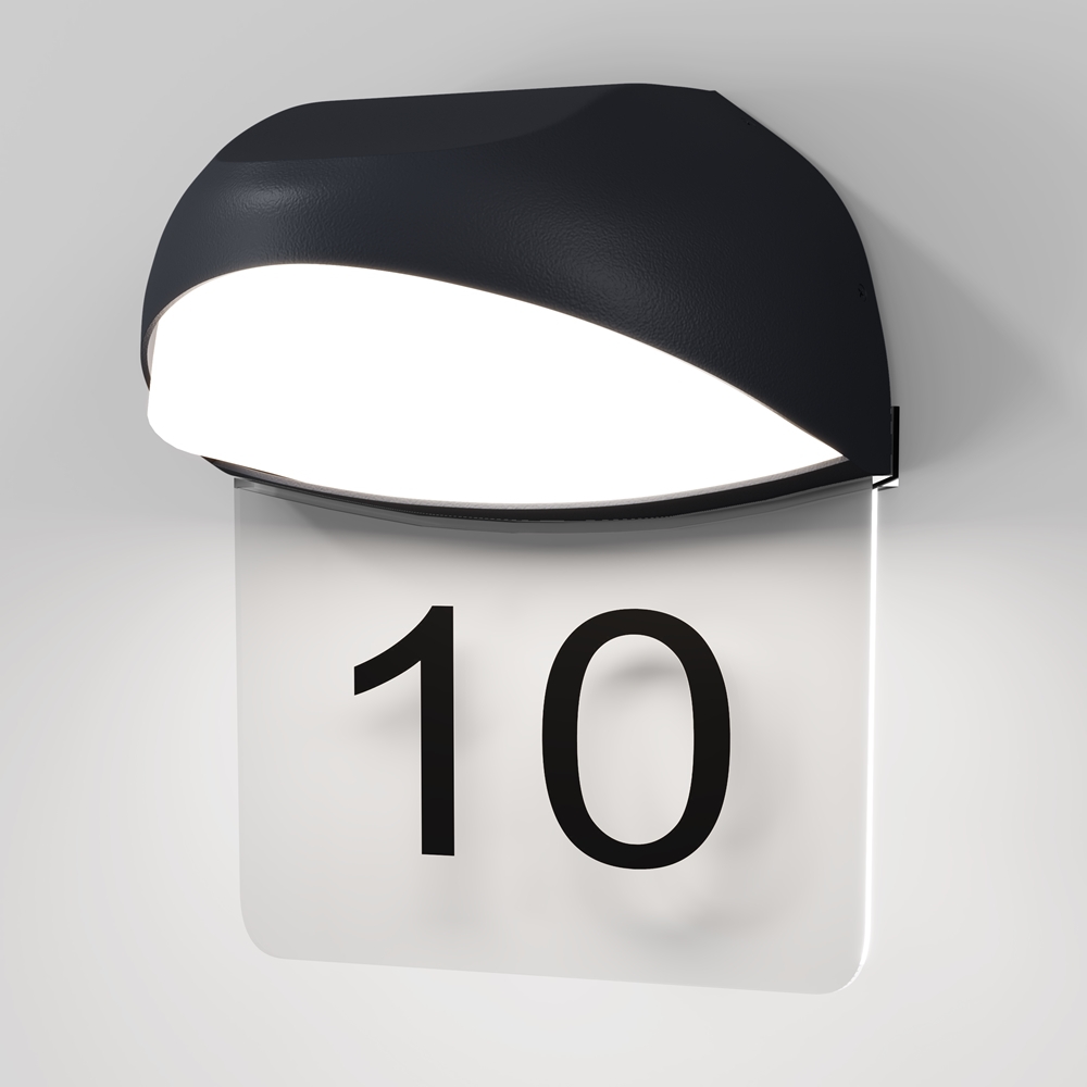 алуминий в цвят графит, дифузер от бял матов акрил, платка от прозрачен полимер за поставяне на символ (номер на къща и др.)