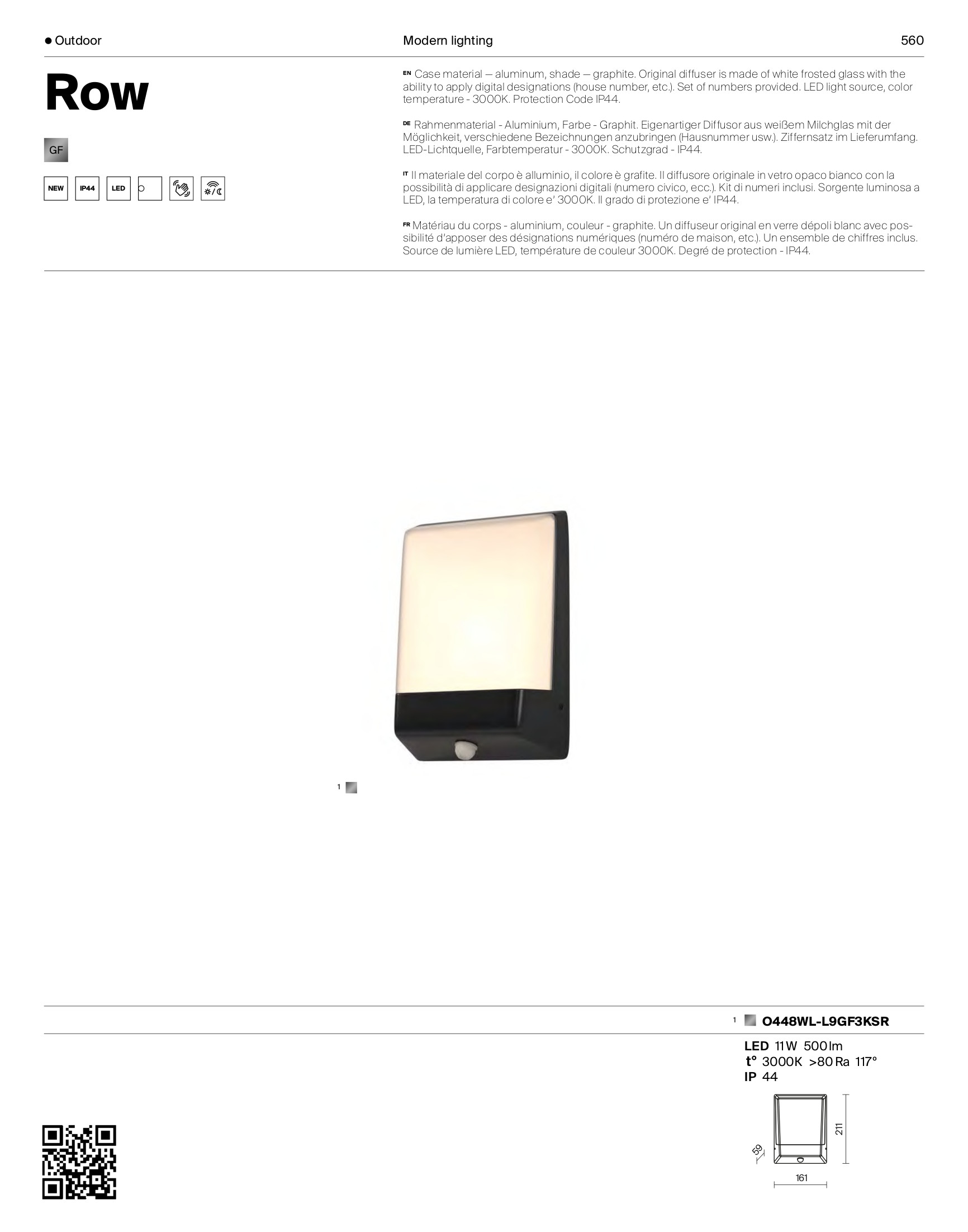 Лед аплик, външна лампа O448WL-L9GF3KSR ще осигури комфорт и естетика във всяко помещение, в което се постави. Цялостната визия и дизайн на led лампата и вложените в изработката й материали, като алуминий в цвят графит, дифузьор от бяло матирано стъкло с възможност за апликация на номер на къща и други обозначения, ще допринесат за един неповторим стил. Благодарение на дългогодишния опит в производството на лед осветление, качествените материали и строгия контрол на качеството на изработка на производителя Maytoni (Германия), O448WL-L9GF3KSR е на високо европейско ниво.