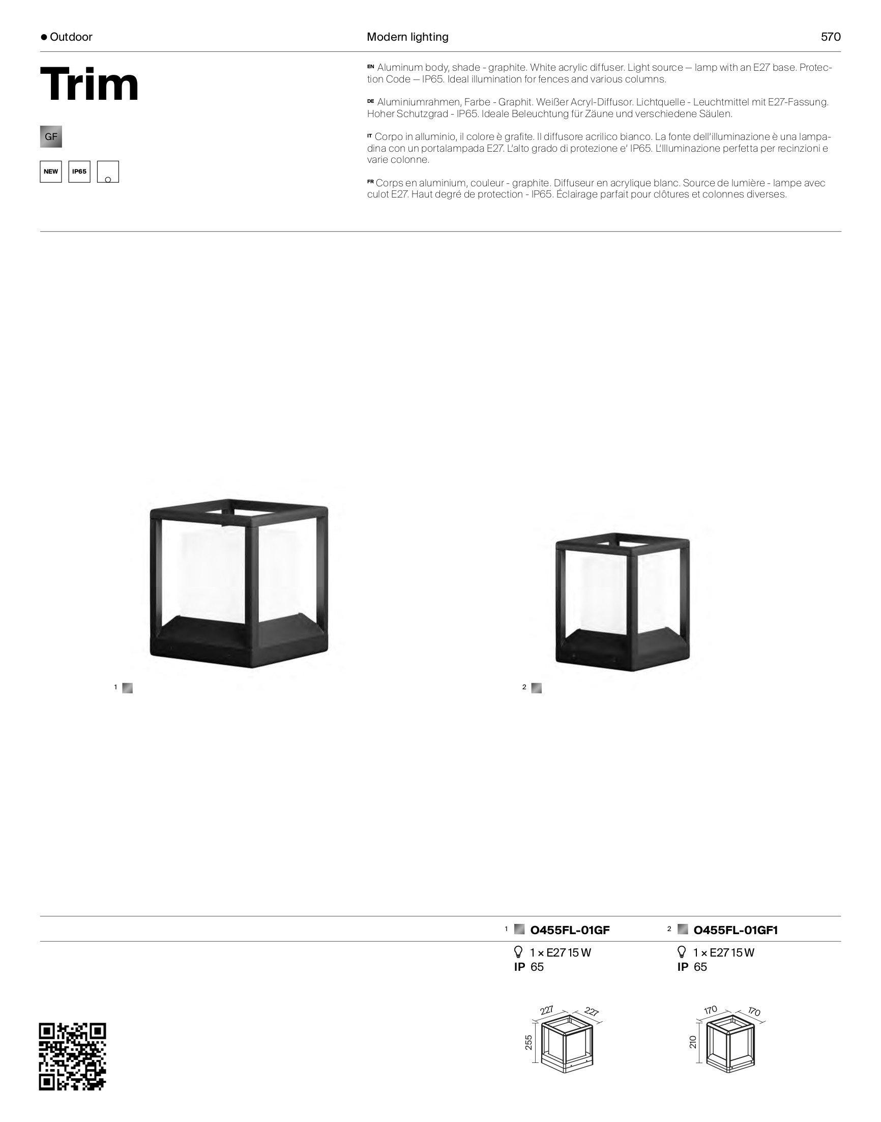 Осветителното тяло O455FL-01GF1 представлява външна лампа в съвременен стил. O455FL-01GF1 е от категорията осветителни тела и е подходящо за осветяване на различни помещения и пространства като: външно осветление, фасадно осветление.