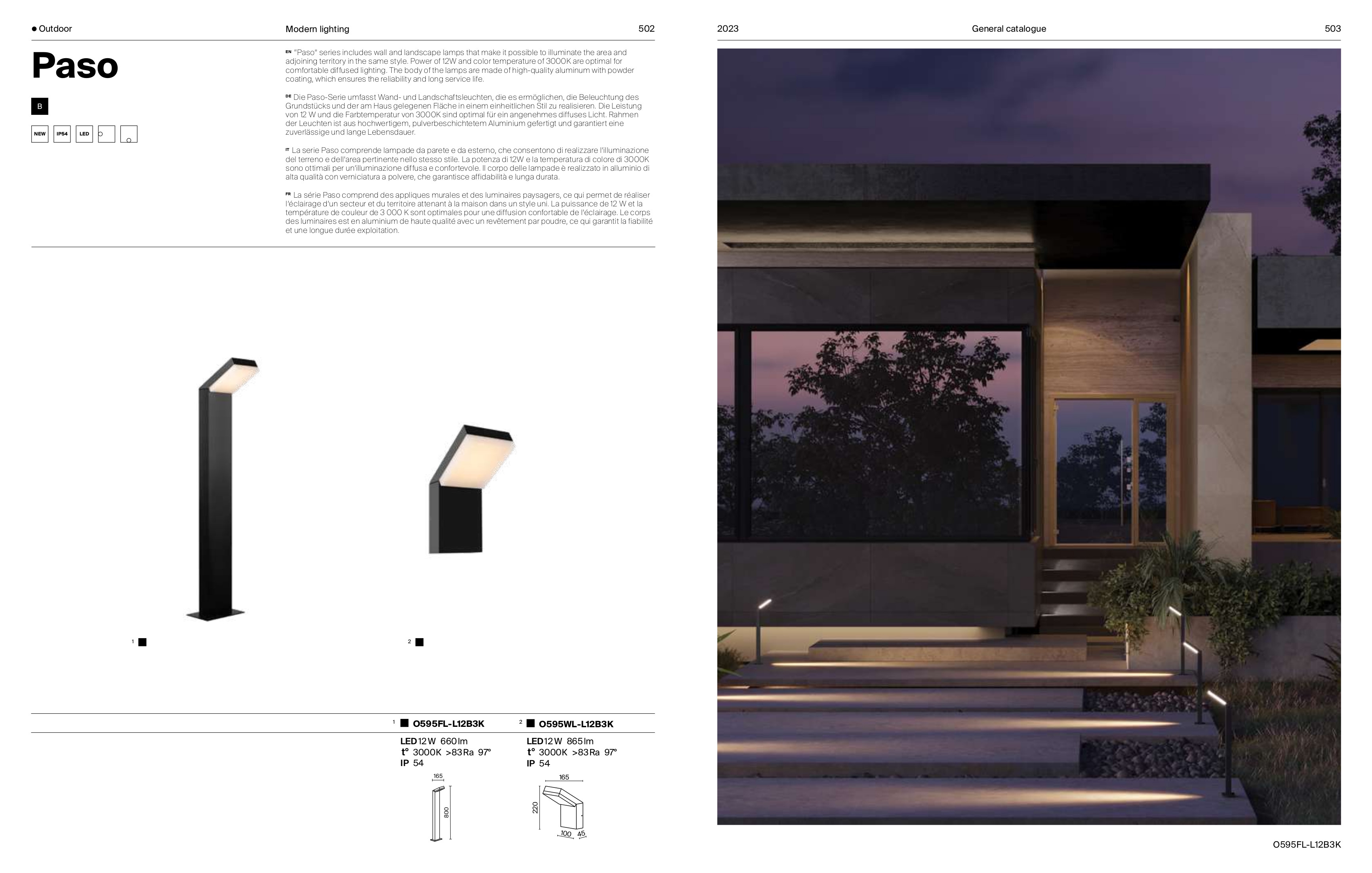 Осветителното тяло O595FL-L12B3K представлява външна лампа в съвременен стил. O595FL-L12B3K е от категорията осветителни тела и е подходящо за осветяване на различни помещения и пространства като: градинско осветление, външно осветление.