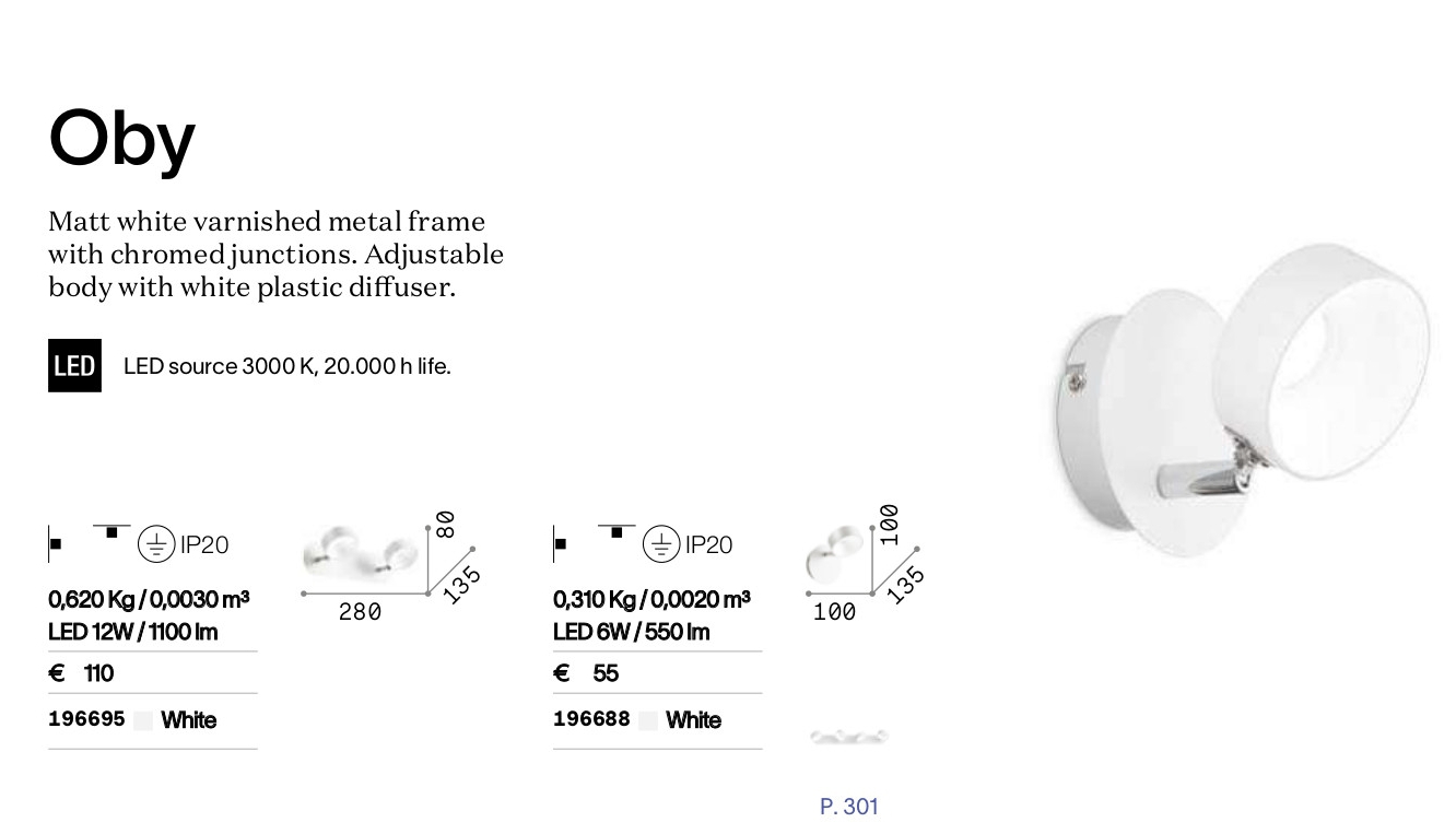 Осветителното тяло OBY AP1 ще осигури комфорт и естетика във всяко помещение, в което се постави. Цялостната визия и дизайн на лампата и вложените в изработката й материали, като метал с нанесено матово бяло лаково покритие, хромирани връзки, регулируемо тяло с дифузер от полимер в бяло, ще допринесат за един неповторим стил. Благодарение на дългогодишния опит, качествените материали и строгия контрол на качеството на изработка на производителя Ideal-Lux (Италия), OBY AP1 е на високо европейско ниво.
