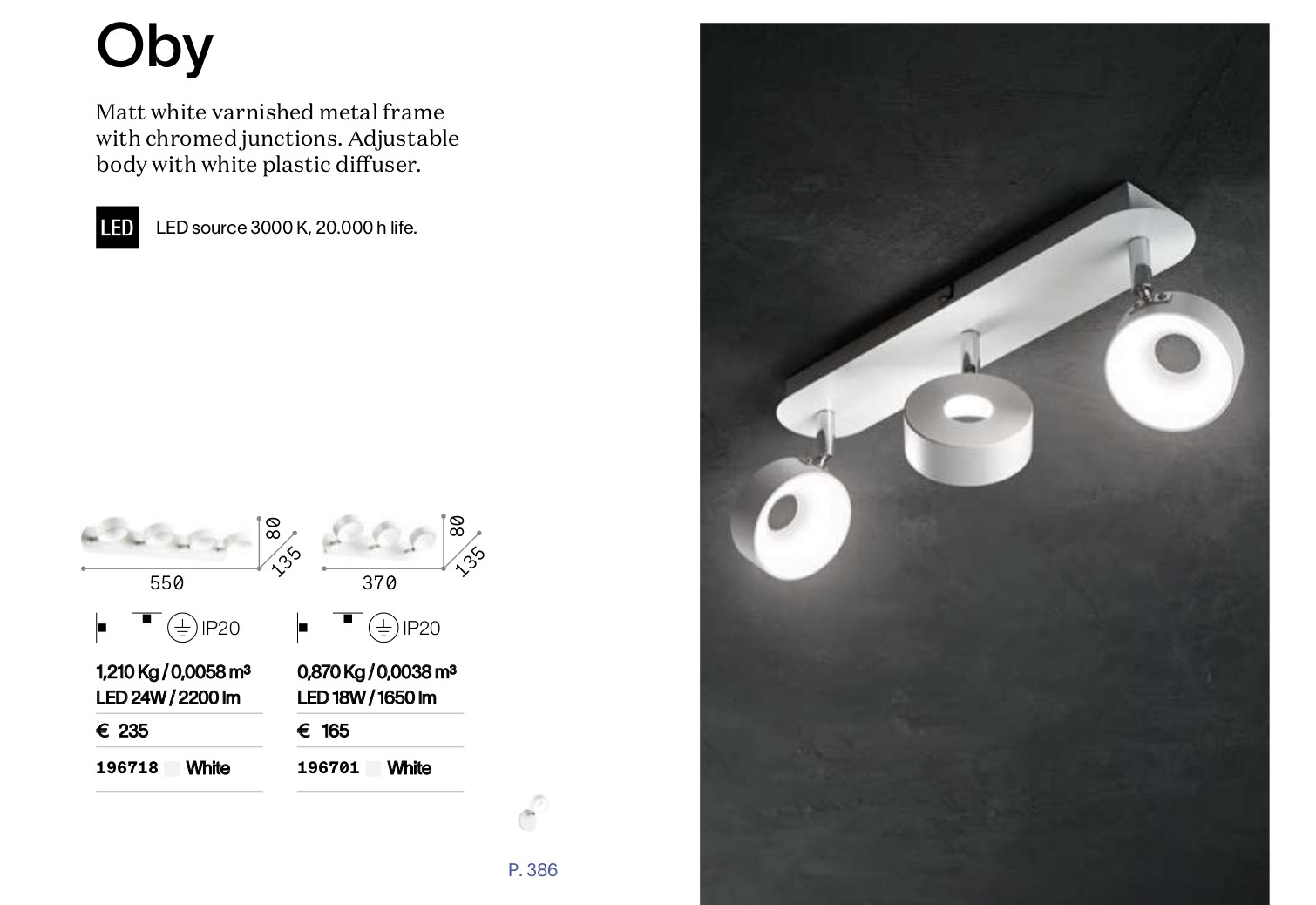 Лед плафон, спот лампа OBY PL3 ще осигури комфорт и естетика във всяко помещение, в което се постави. Цялостната визия и дизайн на led лампата и вложените в изработката й материали, като метал с нанесено матово бяло лаково покритие, хромирани връзки, регулируеми тела с дифузер от полимер в бяло, ще допринесат за един неповторим стил. Благодарение на дългогодишния опит в производството на лед осветление, качествените материали и строгия контрол на качеството на изработка на производителя Ideal-Lux (Италия), OBY PL3 е на високо европейско ниво.
