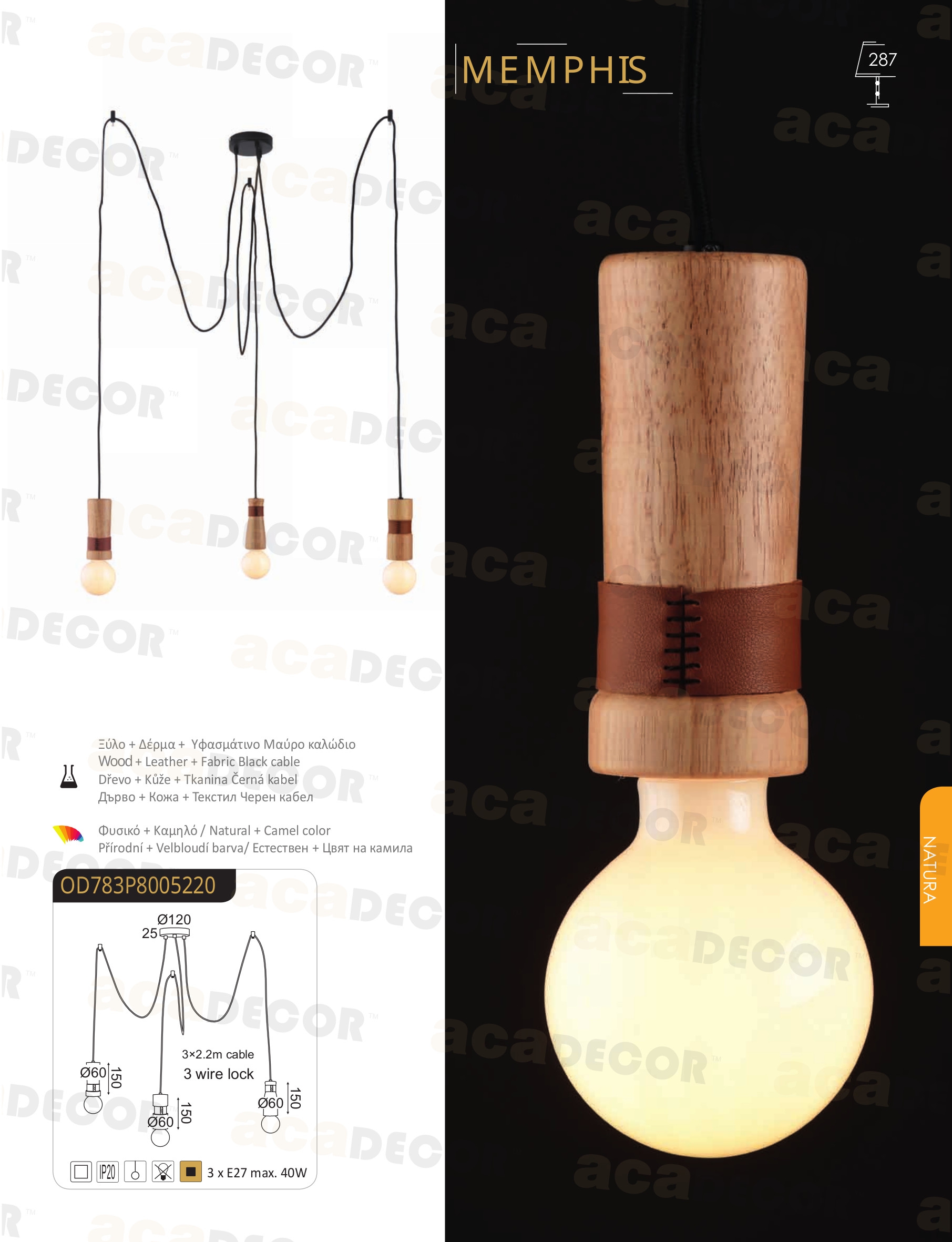 Осветителното тяло OD783P80 ще осигури комфорт и естетика във всяко помещение, в което се постави. Цялостната визия и дизайн на лампата и вложените в изработката й материали, като дърво в естествен цвят, кожа в цвят на камила, кабел с черна текстилна оплетка, ще допринесат за един неповторим стил. Благодарение на дългогодишния опит, качествените материали и строгия контрол на качеството на изработка на производителя ACA-Lighting (Гърция), OD783P80 е на високо европейско ниво.