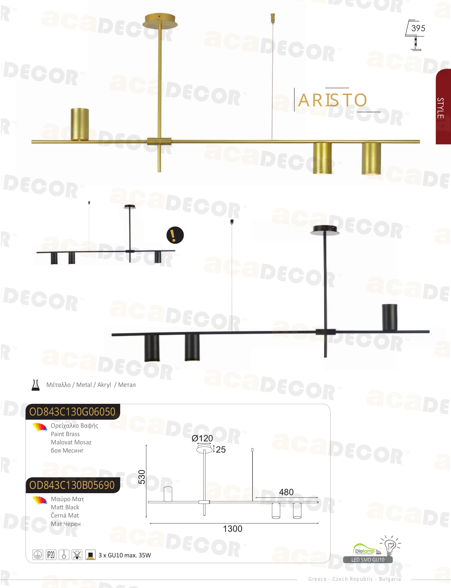 Осветителното тяло OD843C130G ще осигури комфорт и естетика във всяко помещение, в което се постави. Цялостната визия и дизайн на лампата и вложените в изработката й материали, като метал в цвят месинг, ще допринесат за един неповторим стил. Благодарение на дългогодишния опит, качествените материали и строгия контрол на качеството на изработка на производителя ACA-Lighting (Гърция), OD843C130G е на високо европейско ниво.