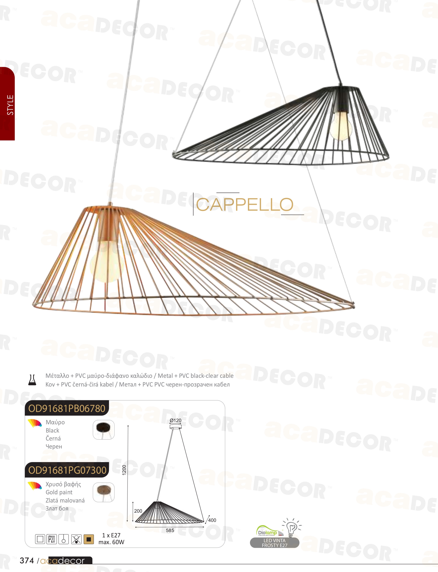 Осветителното тяло OD91681PG ще осигури комфорт и естетика във всяко помещение, в което се постави. Цялостната визия и дизайн на лампата и вложените в изработката й материали, като метал в цвят злато, черен/прозрачен PVC кабел, ще допринесат за един неповторим стил. Благодарение на дългогодишния опит, качествените материали и строгия контрол на качеството на изработка на производителя ACA-Lighting (Гърция), OD91681PG е на високо европейско ниво.