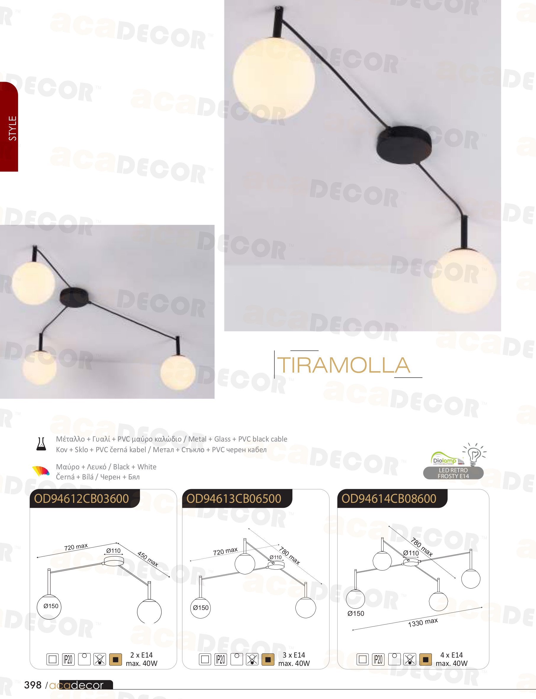 Осветителното тяло OD94612CB ще осигури комфорт и естетика във всяко помещение, в което се постави. Цялостната визия и дизайн на лампата и вложените в изработката й материали, като метал в черен цвят, стъкло в бяло, черен PVC кабел, ще допринесат за един неповторим стил. Благодарение на дългогодишния опит, качествените материали и строгия контрол на качеството на изработка на производителя ACA-Lighting (Гърция), OD94612CB е на високо европейско ниво.