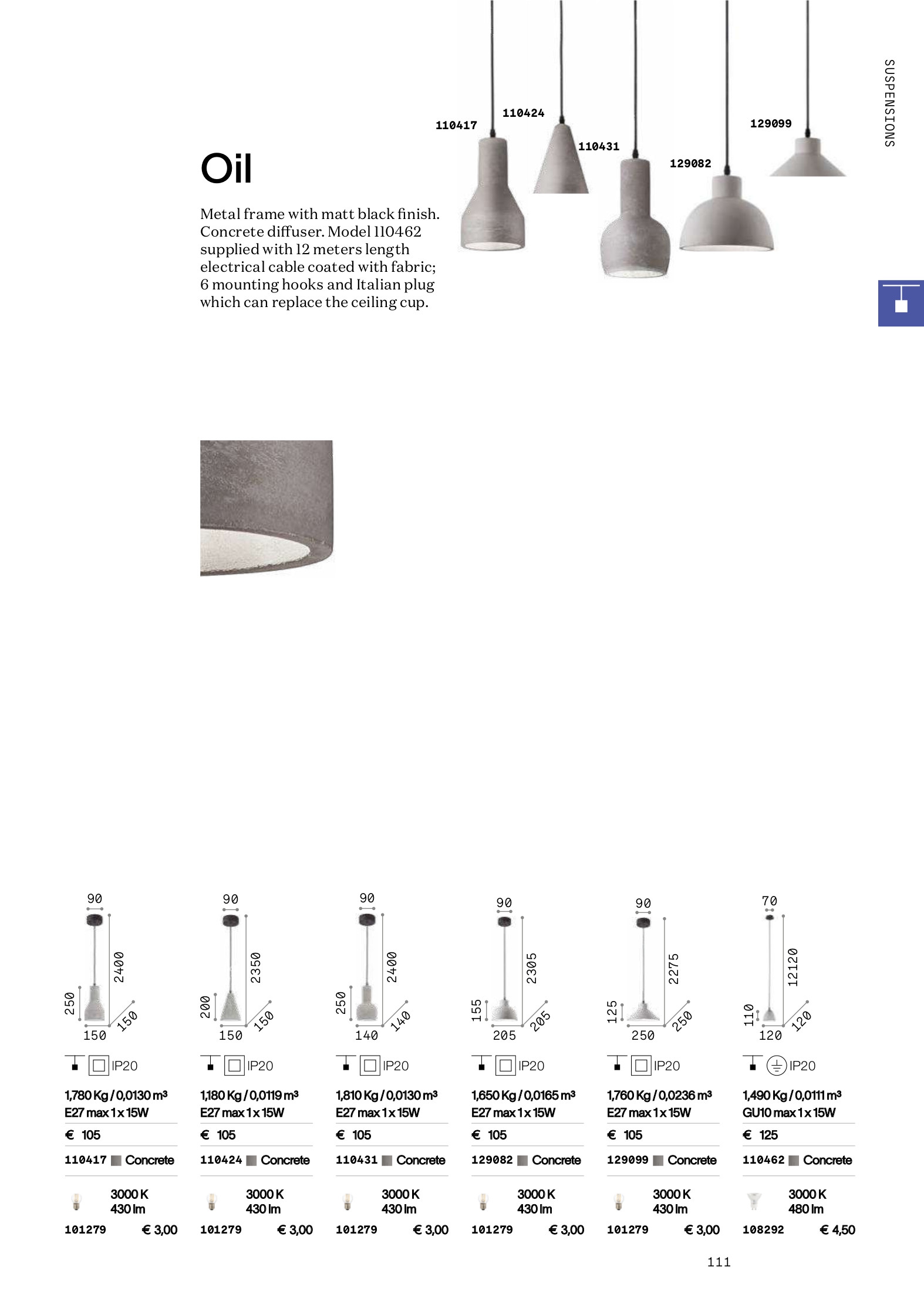 Стилът и естетиката на обстановката ще се обогатят благодарение, както на цялостната визия и дизайн на осветителното тяло, така и на вложените в изработката му, качествени материали, като: дифузер от бетон, 12m черен електрически кабел с италиански щепсел, 6 монтажни куки.
