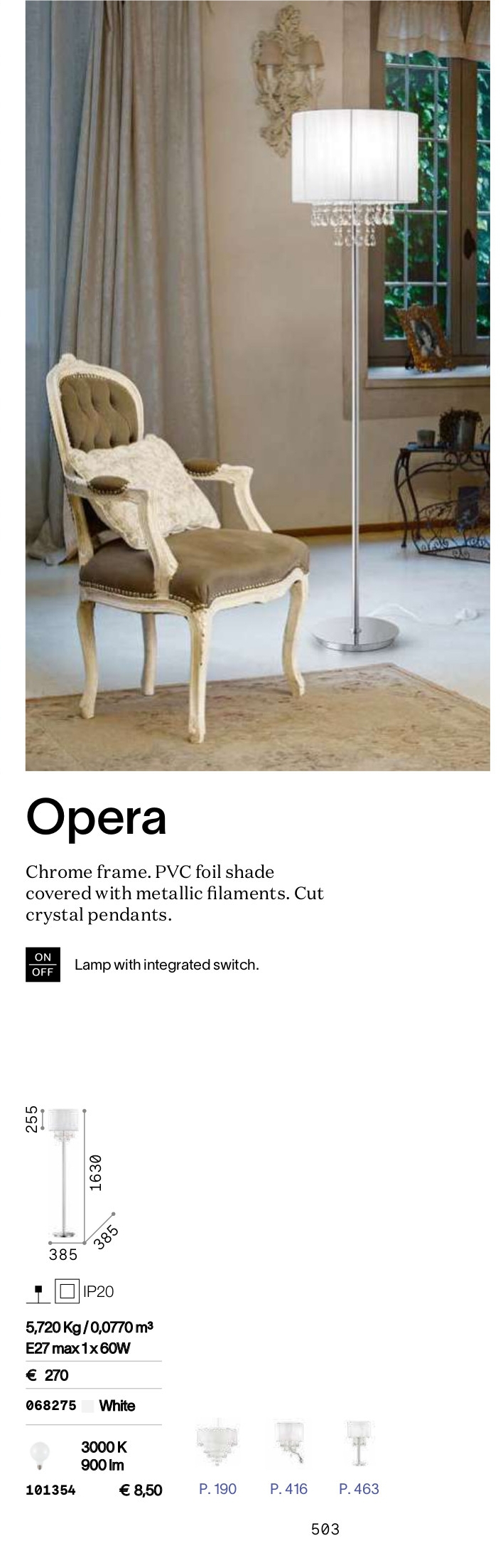 Осветителното тяло OPERA PT1 BIANCO ще осигури комфорт и естетика във всяко помещение, в което се постави. Цялостната визия и дизайн на лампата и вложените в изработката й материали, като хромиран метал, абажур от бял текстил с втъкани метални нишки, фасетирани кристални висулки, захранващ кабел и ключ ON/OFF, ще допринесат за един неповторим стил. Благодарение на дългогодишния опит, качествените материали и строгия контрол на качеството на изработка на производителя Ideal-Lux (Италия), OPERA PT1 BIANCO е на високо европейско ниво.