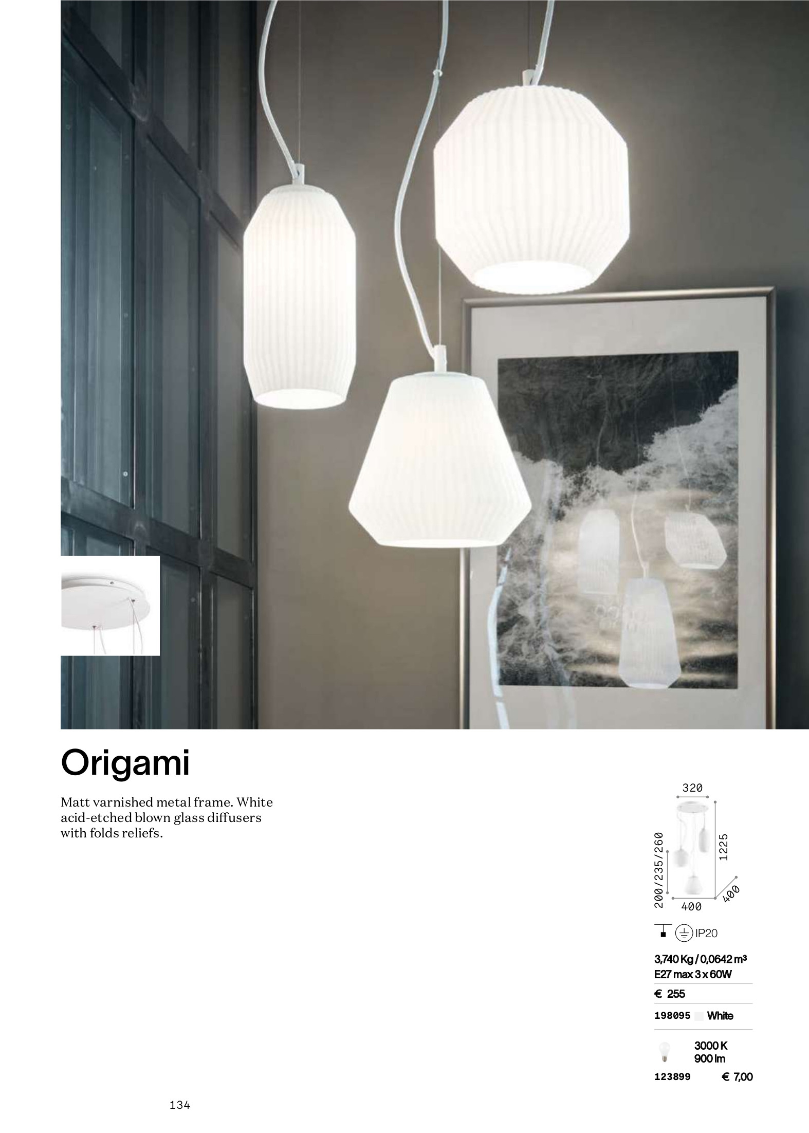 Осветителното тяло ORIGAMI SP3 ще осигури комфорт и естетика във всяко помещение, в което се постави. Цялостната визия и дизайн на лампата и вложените в изработката й материали, като метал в цвят бял мат, духано стъкло в бял цвят с релеф на гънки, ще допринесат за един неповторим стил. Благодарение на дългогодишния опит, качествените материали и строгия контрол на качеството на изработка на производителя Ideal-Lux (Италия), ORIGAMI SP3 е на високо европейско ниво.