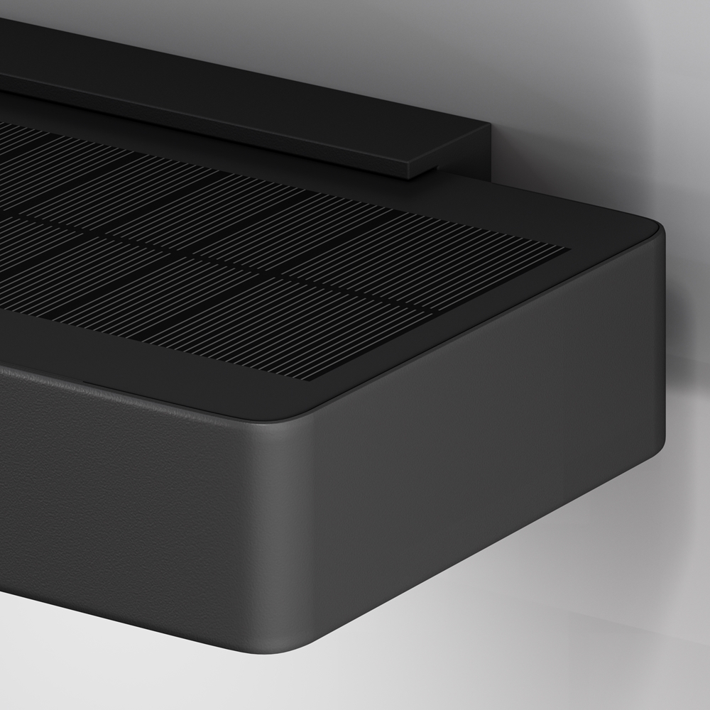 алуминий в цвят графит, соларна лампа без нужда от захранване, работи 14 часа без презареждане, вграден сензор за движение и осветеност