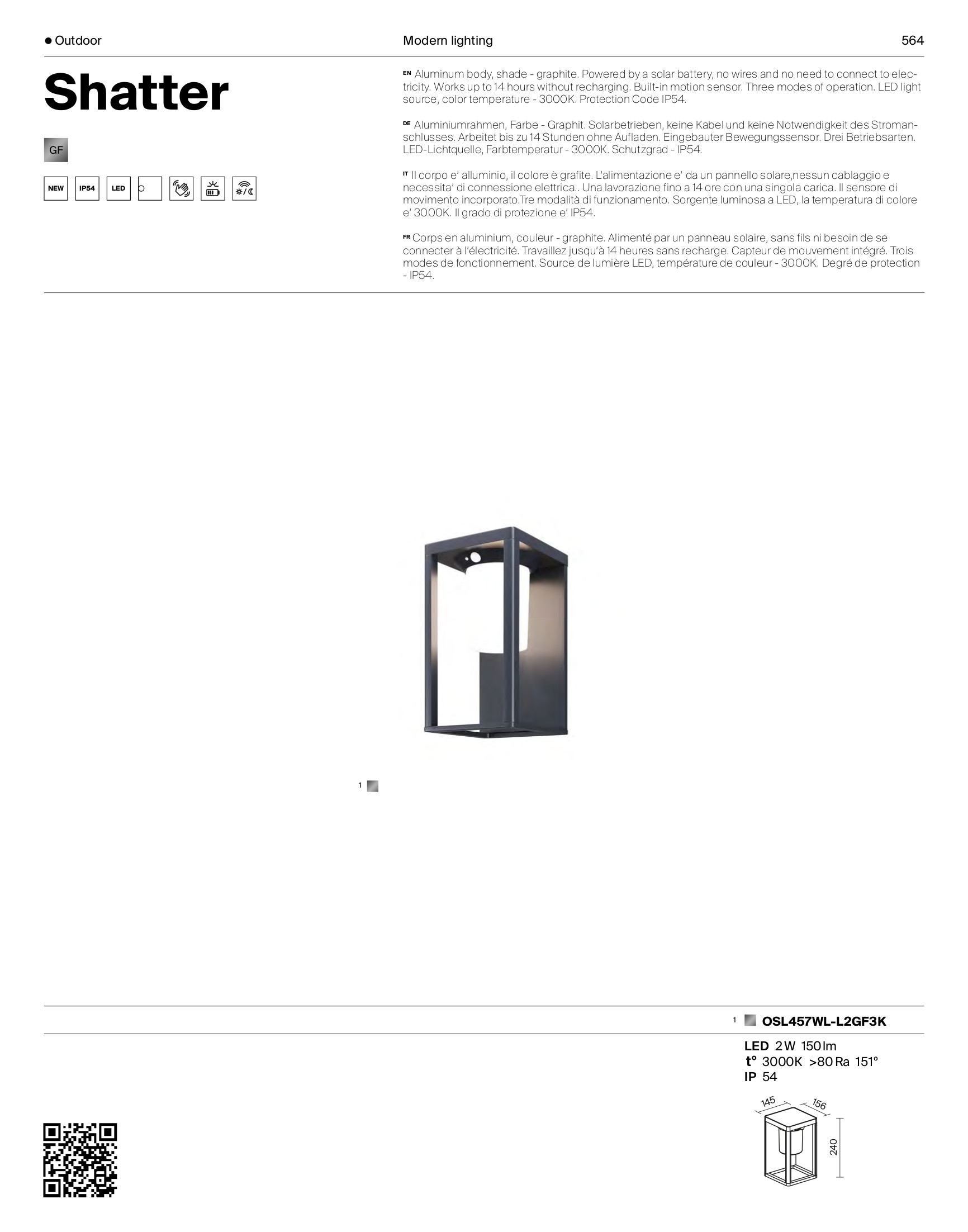 Осветителното тяло OSL457WL-L2GF3K ще осигури комфорт и естетика във всяко помещение, в което се постави. Цялостната визия и дизайн на лампата и вложените в изработката й материали, като алуминий в цвят графит, соларна лампа без нужда от захранване, работи 14 часа без презареждане, вграден сензор за движение и осветеност, ще допринесат за един неповторим стил. Благодарение на дългогодишния опит, качествените материали и строгия контрол на качеството на изработка на производителя Maytoni (Германия), OSL457WL-L2GF3K е на високо европейско ниво.