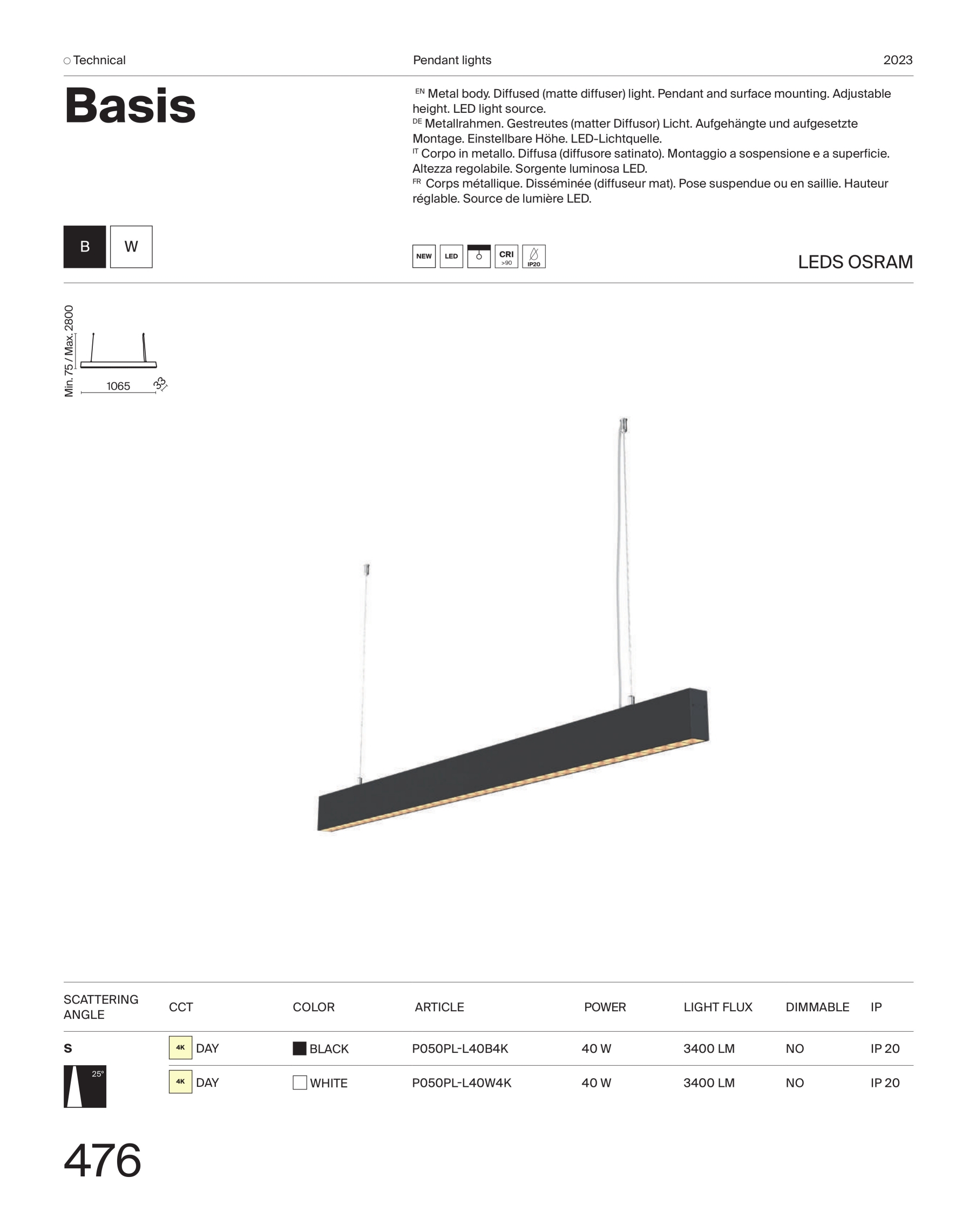 Осветителното тяло P050PL-L40B4K представлява лед пендел в съвременен стил. P050PL-L40B4K е от категорията и е подходящо за осветяване на различни помещения и пространства като: всекидневна / хол, спалня, кухня, трапезария, коридор, антре, офис.