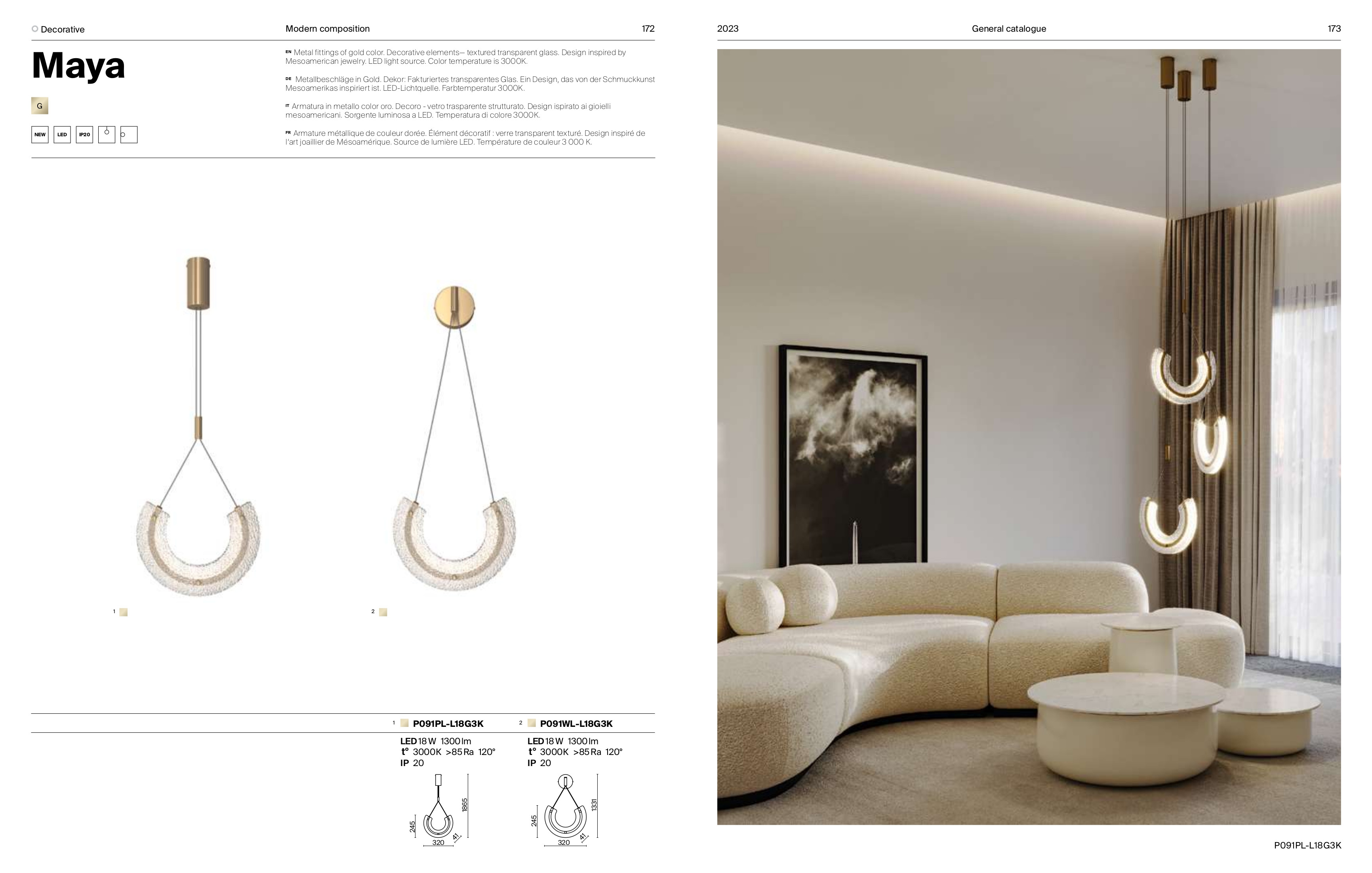 Осветителното тяло P091WL-L18G3K ще осигури комфорт и естетика във всяко помещение, в което се постави. Цялостната визия и дизайн на лампата и вложените в изработката й материали, като метал в цвят злато, декоративно текстурирано прозрачно стъкло, дизайн вдъхновен от мезоамерикански бижута, ще допринесат за един неповторим стил. Благодарение на дългогодишния опит, качествените материали и строгия контрол на качеството на изработка на производителя Maytoni (Германия), P091WL-L18G3K е на високо европейско ниво.