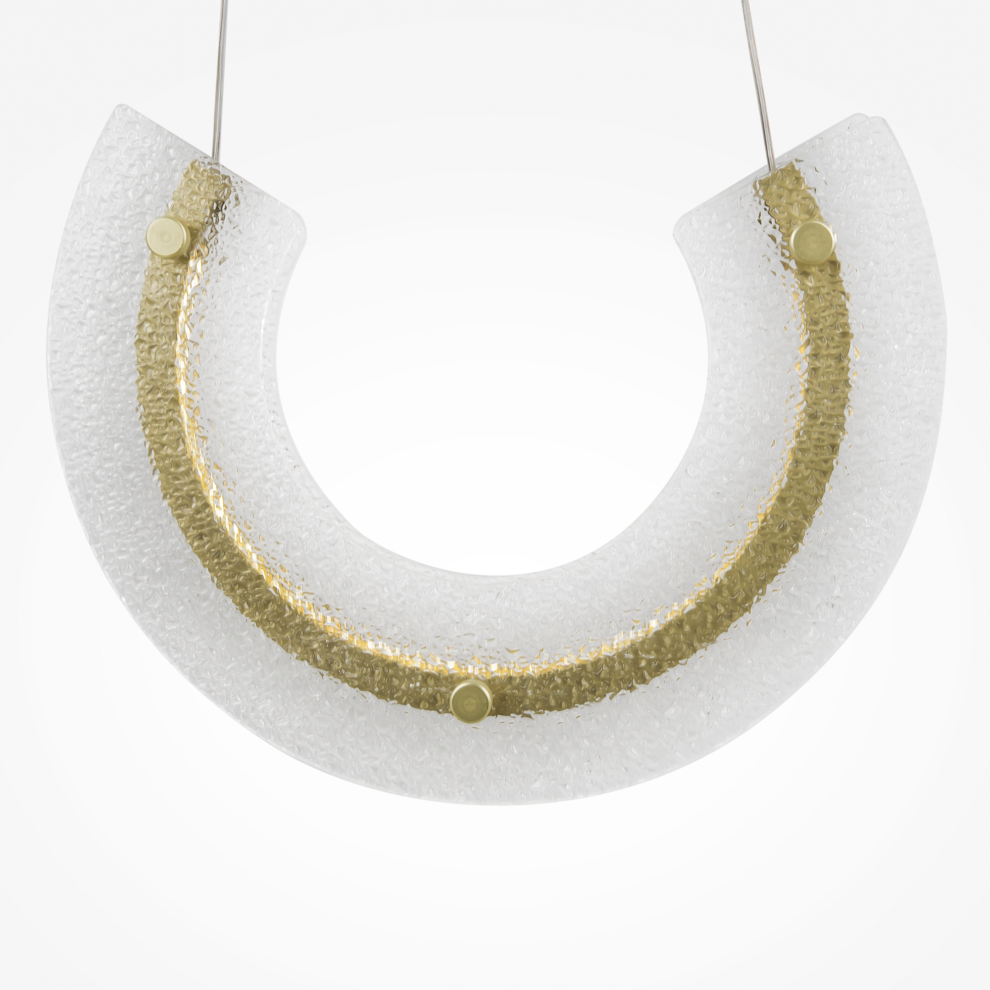 метал в цвят злато, декоративно текстурирано прозрачно стъкло, дизайн вдъхновен от мезоамерикански бижута