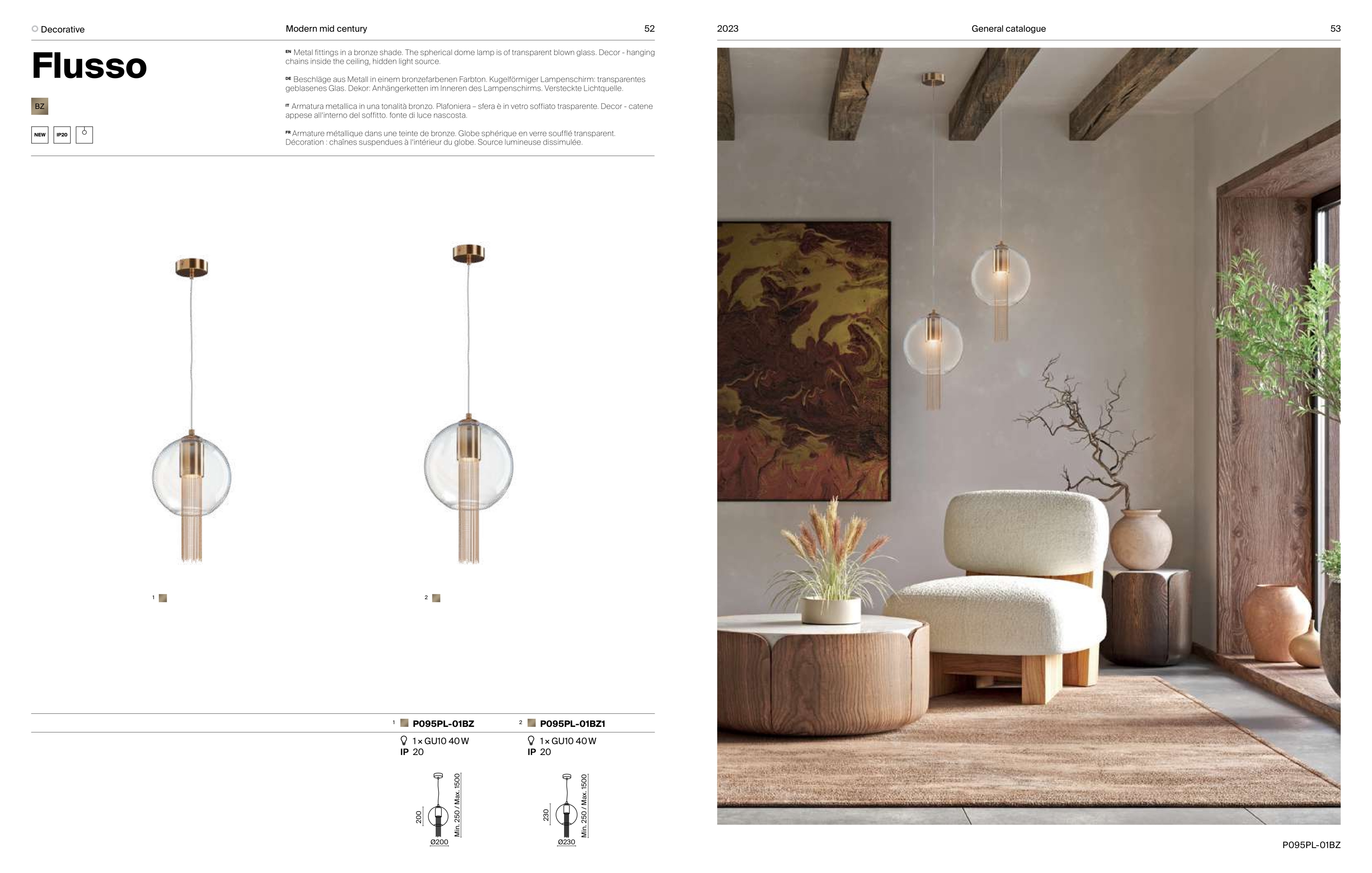 Осветителното тяло P095PL-01BZ ще осигури комфорт и естетика във всяко помещение, в което се постави. Цялостната визия и дизайн на лампата и вложените в изработката й материали, като метал в цвят бронз, сфера от прозрачно духано стъкло, висящи верижки в цвят бронз, скрит източник на светлина, ще допринесат за един неповторим стил. Благодарение на дългогодишния опит, качествените материали и строгия контрол на качеството на изработка на производителя Maytoni (Германия), P095PL-01BZ е на високо европейско ниво.