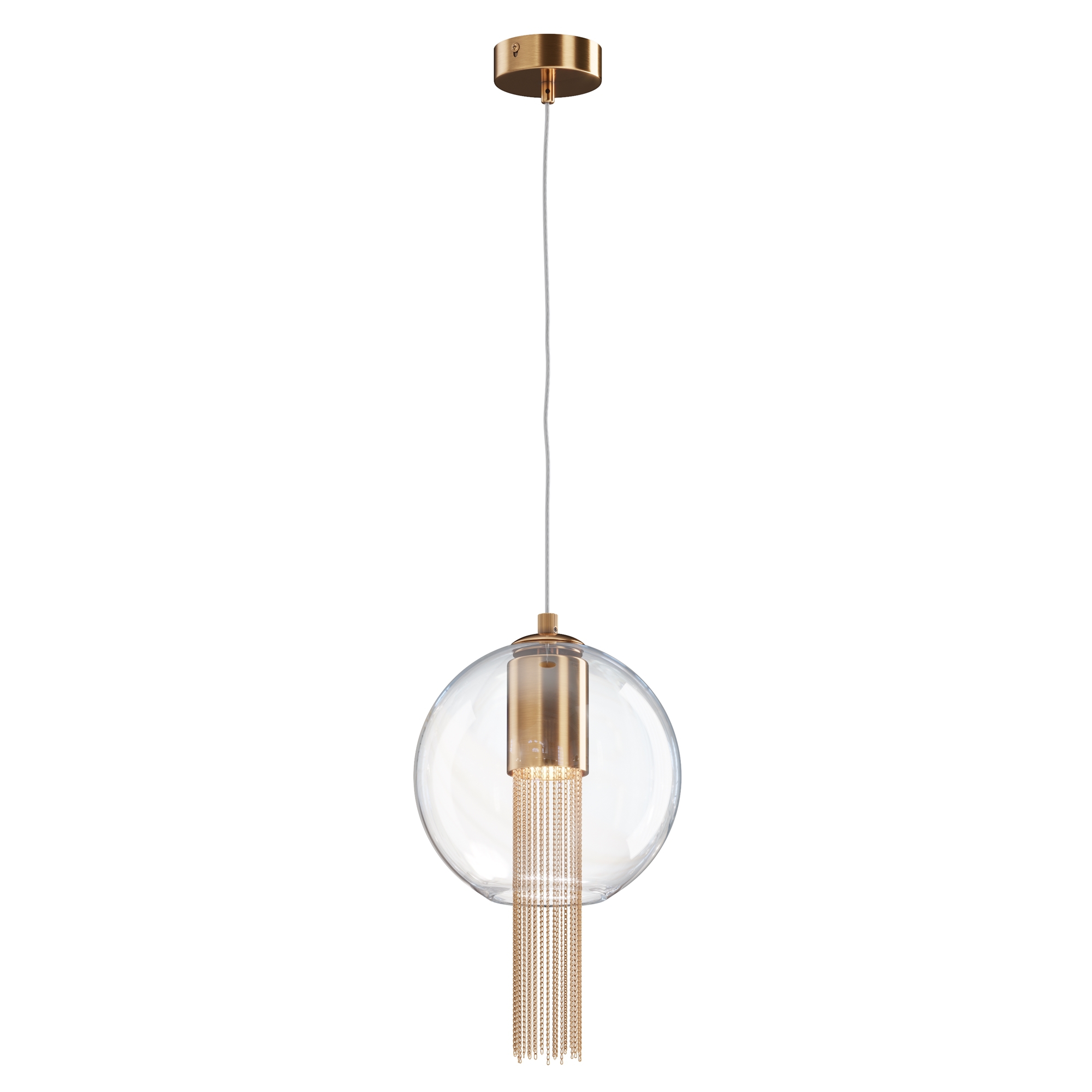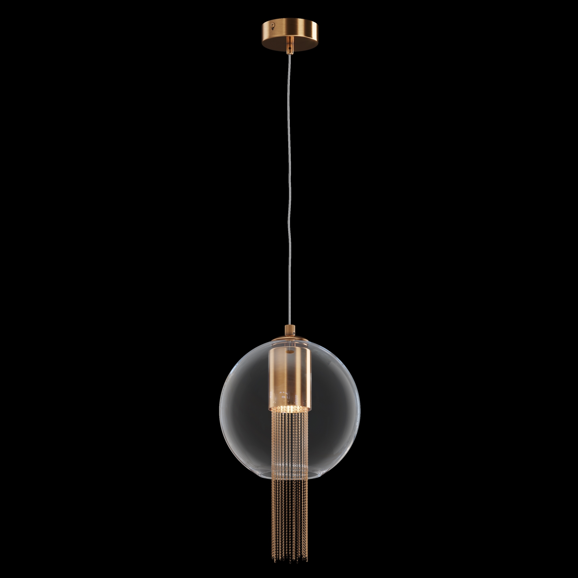 метал в цвят бронз, сфера от прозрачно духано стъкло, висящи верижки в цвят бронз, скрит източник на светлина